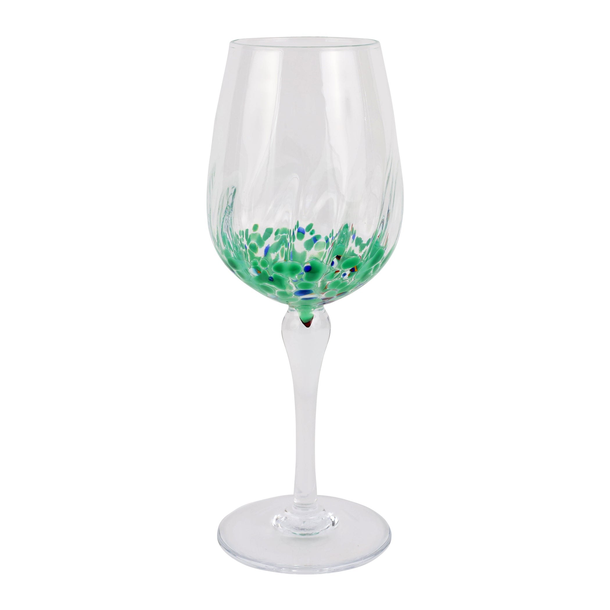 Dynamic streaks of blue adorn the mouthblown Chiara Green Wine Glass. Whether you go for a single color or a mix of the different Chiara hues, the confident ribbons of color create a unique and lively table.