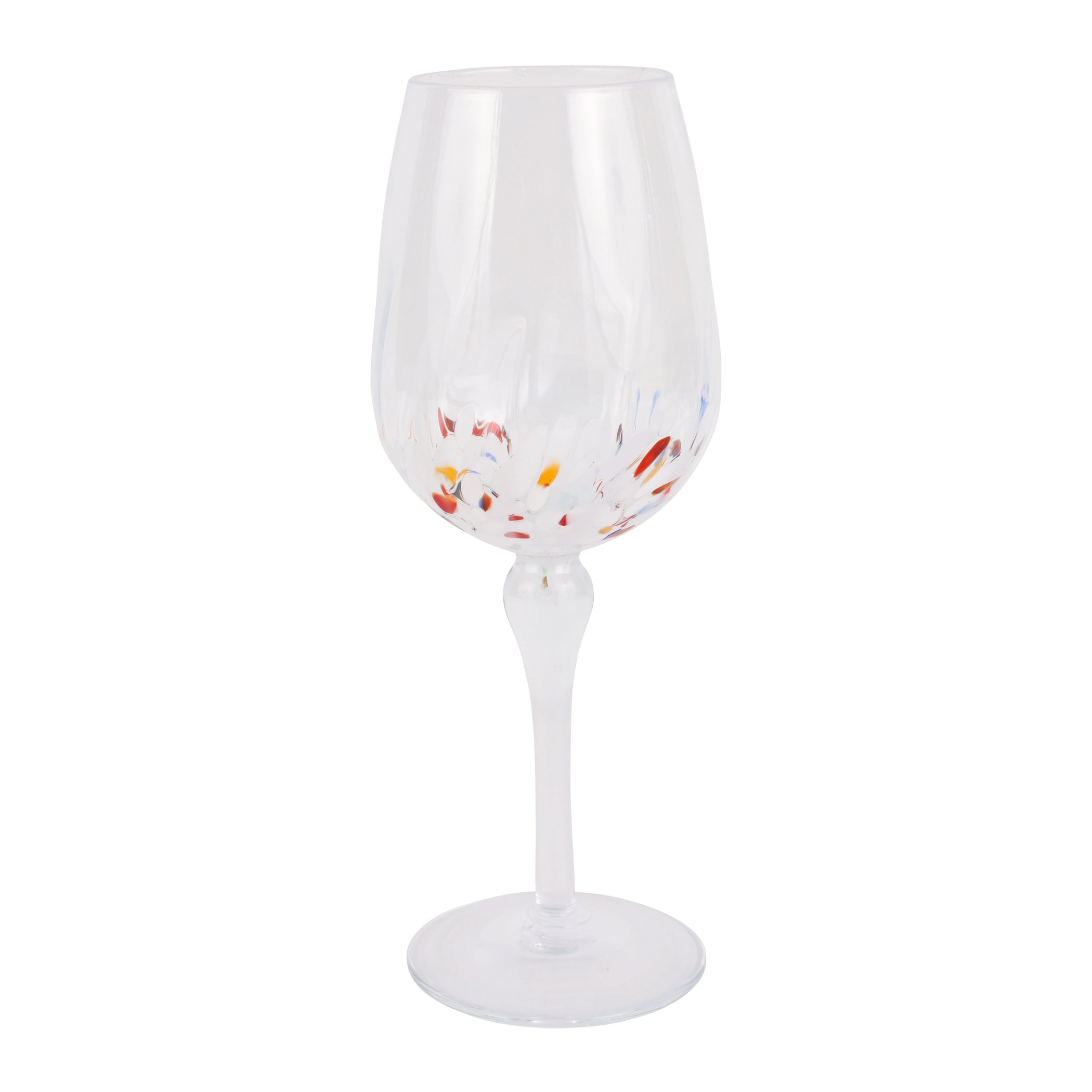 Dynamic streaks of color adorn the mouthblown Chiara White Wine Glass. Whether you go for a table of all Chiara White or a mix of the different Chiara hues, the confident ribbons of color a unique and lively table.