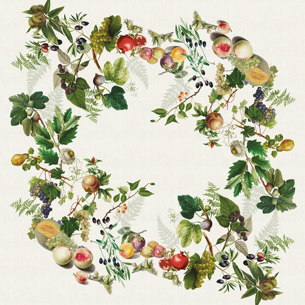 Displaying a lush array of fruits, vines, and leaves in green, red, and orange against a soft cream backdrop, the Abondance D'Automne Natural Tablecloth embodies the abundance of the Fall season. Made from a luxurious cotton-linen blend, this tablecloth evokes the rich essence of autumn. This printed design was crafted from original artwork, hand-drawn by our in-house team of textile artisans & designers in France. Combining the best qualities of cotton and linen, this fabric blend seamlessly enhances the table with its effortless appearance while providing durability and long-lasting performance. Create a captivating Fall tablescape with the Abondance D'Automne Natural Tablecloth, which elegantly captures the essence of the season with its lush depiction of fruits, vines, and leaves against a soft cream backdrop, offering both style and durability for your gatherings.