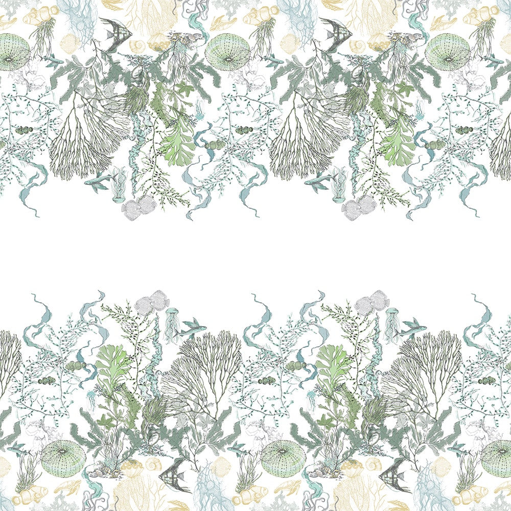 Tropical fish, coral, and seaweed float in water, brought to life in shades of white, green, blue, grey, and yellow on the Balade Marine Verde Tablecloth by Garnier Thiebaut. This printed design was crafted from original artwork, hand-drawn by our in-house team of textile artisans and designers in France. Combining the best qualities of cotton and linen, this fabric blend seamlessly enhances the table with its effortless appearance while providing durability and long-lasting performance.