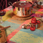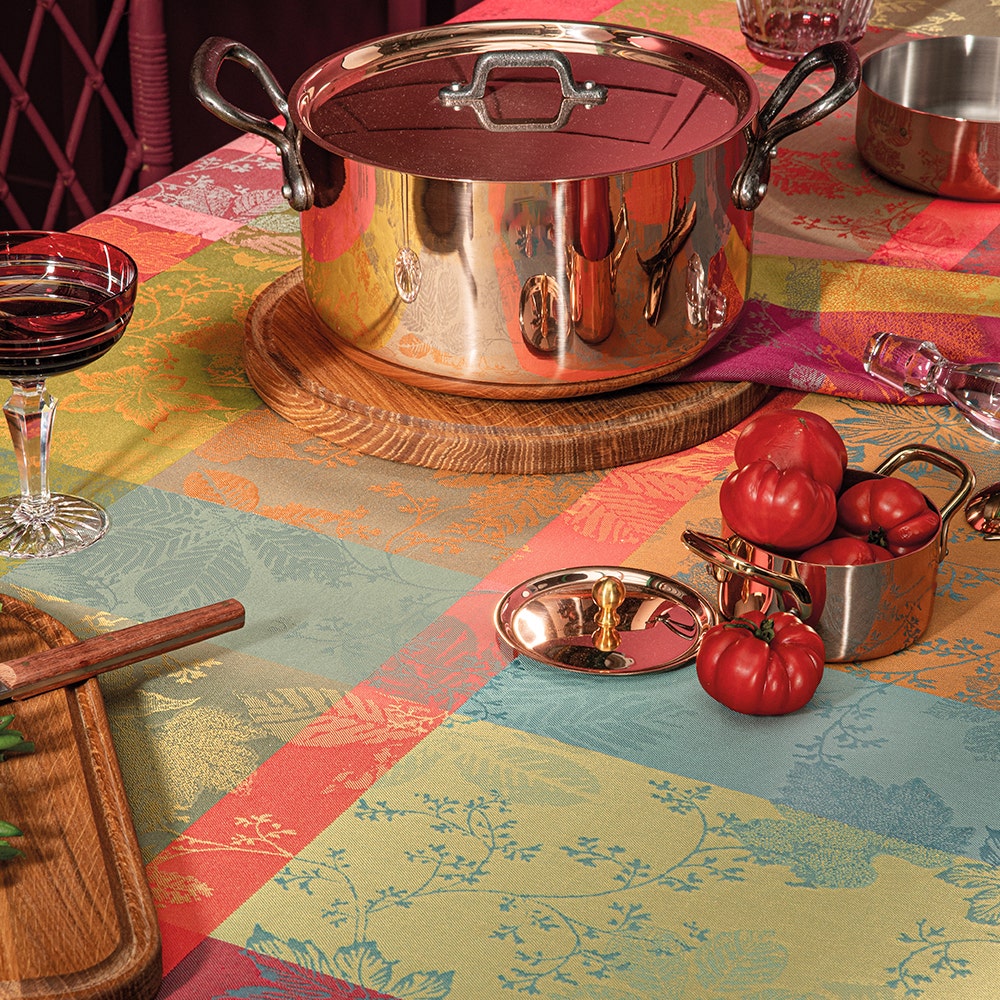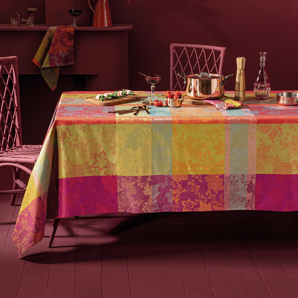 The jewel-tone leaves in red, purple, and green on the coated cotton Mille Sous Bois Automne Tablecloth help make your table the centerpiece this fall. This woven design was crafted from original artwork, hand-drawn by our in-house team of textile artisans & designers in France. Constructed on jacquard looms with extra long staple cotton, Garnier Thiebaut USA's jacquard table linen collections are woven for longevity, and can last for generations with the proper washing maintenance and use.The coated cotton treatment used on the Mille Sous Bois Automne Tablecloth helps prevent any staining that would ruin the fabric's color, and makes any clean up as easy as one swipe of a sponge.