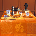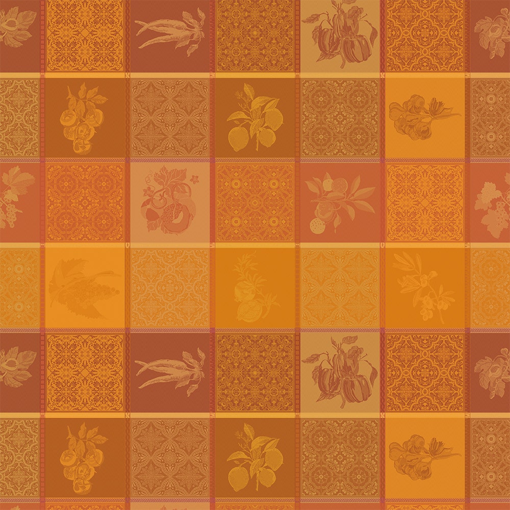 Welcome the colors of fall into your culinary space with the 100% cotton Mille Tutti Frutti Ocre Tablecloth, adorned with a delightful assortment of fruits, vegetables, and graceful floral motifs in shades of golden orange. This woven design was crafted from original artwork, hand-drawn by our in-house team of textile artisans & designers in France. Constructed on jacquard looms with extra long staple cotton, Garnier Thiebaut USA's jacquard table linen collections are woven for longevity, and can last for generations with the proper washing maintenance and use. Elevate your dining experience with the Mille Tutti Frutti Ocre Tablecloth, designed to not only add a touch of seasonal charm to your table but also withstand the test of time, ensuring countless gatherings to come.