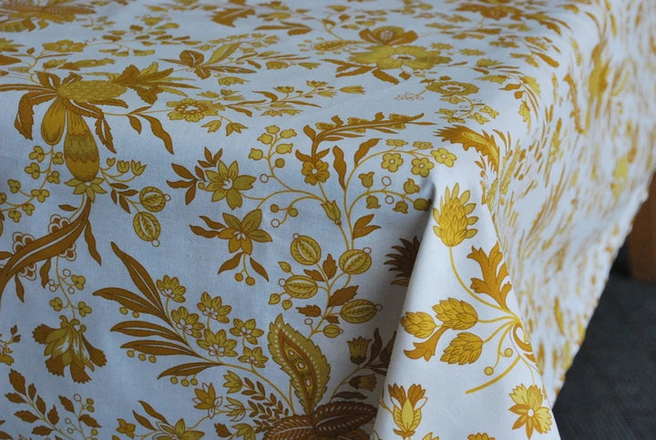 This 70" round tablecloth features a classic Versailles pattern in cheerful yellow and white. Made from Enduit coated cotton, it’s easy to wipe clean and perfect for everyday meals or casual entertaining.