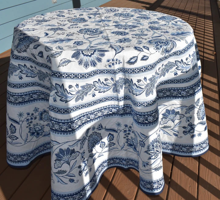 This round 70" cotton tablecloth features a classic Dubbary blue and white check pattern. It's perfect for meals or casual entertaining.