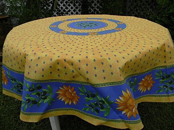 This 70" round tablecloth features a cheerful blue sunflower pattern on Enduit coated cotton. Its easy-to-wipe surface makes it perfect for everyday meals or casual entertaining.