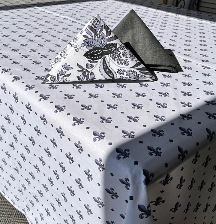 This 70" round coated cotton tablecloth features the elegant Versailles pattern in classic black and white. Made from Enduit coated cotton, it is easy to wipe clean, making it perfect for everyday dining or casual gatherings. Add a touch of sophistication to your table with this stylish and practical tablecloth.