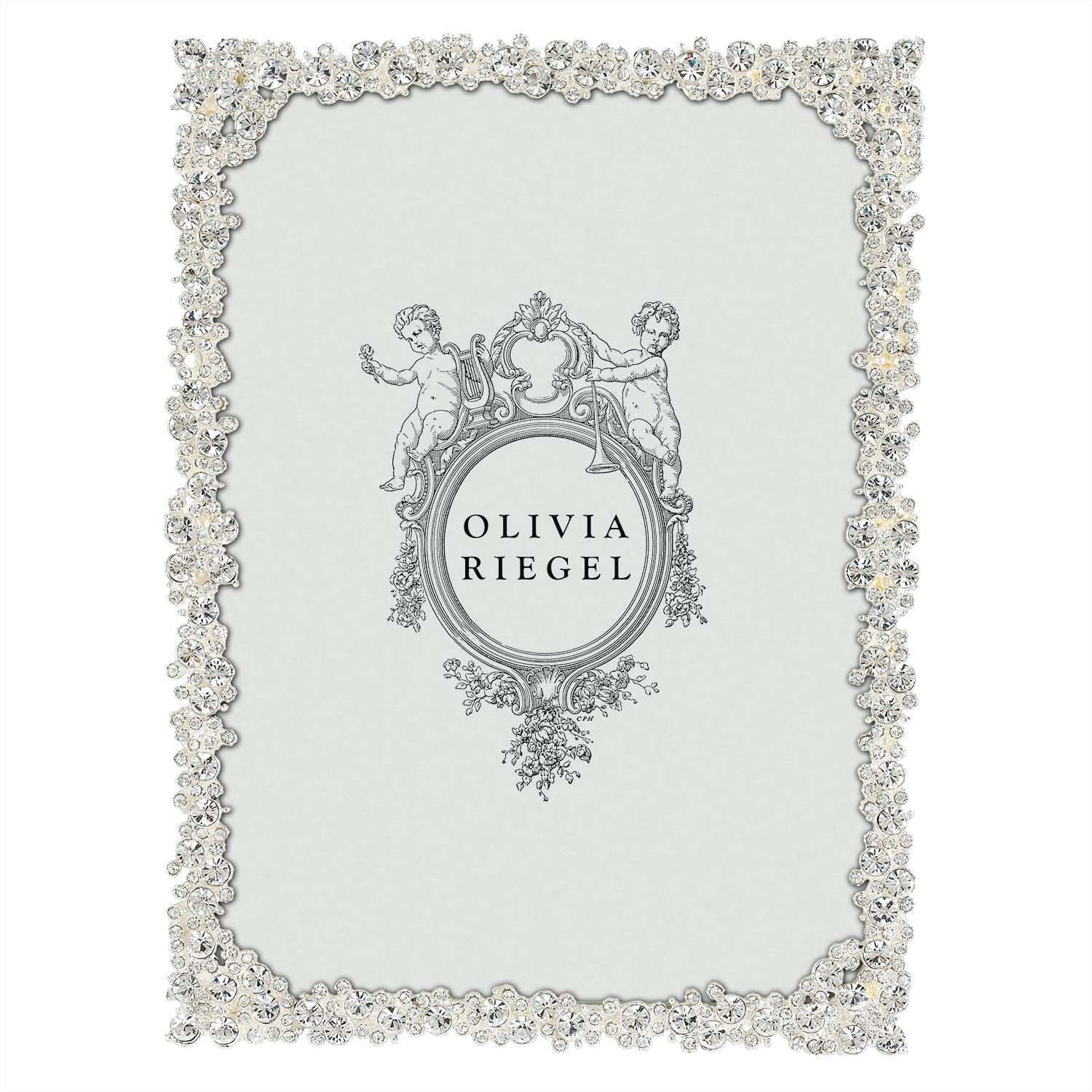 Stunning clusters of hundreds of hand-set clear European crystals in silver finished cast pewter. Elegant gray moiré silk back with easel for vertical or horizontal placement. Tarnish resistant. Signature luxury gift box included.
