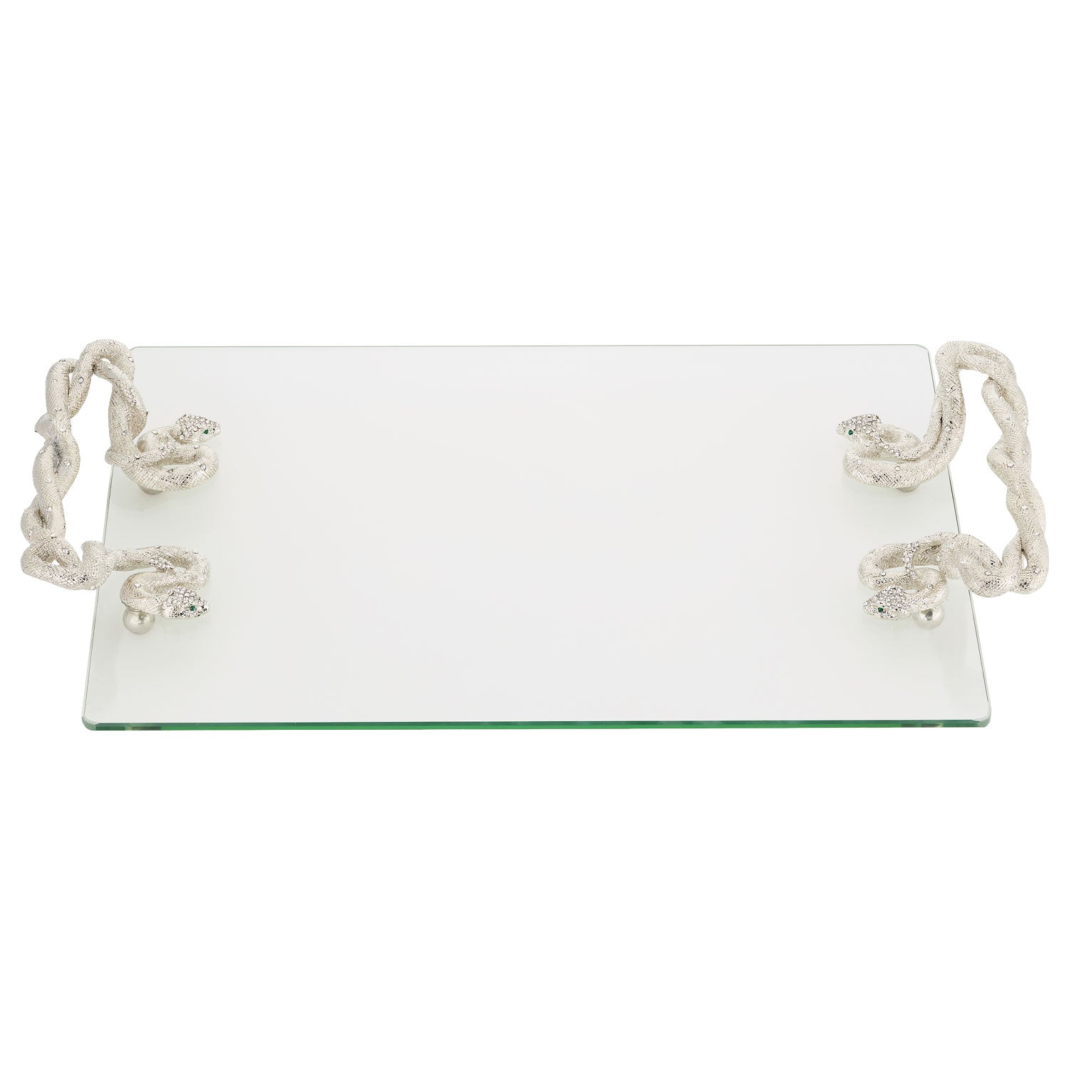 Celebrate the wisdom and mystery of the 2025 year of the snake with this chic addition to any vanity, tabletop, or elsewhere. Footed clear glass tray with entwined silver finished pewter serpent patterned handles. Hand-set clear European crystals. Hand-wash only. Tarnish resistant. Signature luxury gift box included.