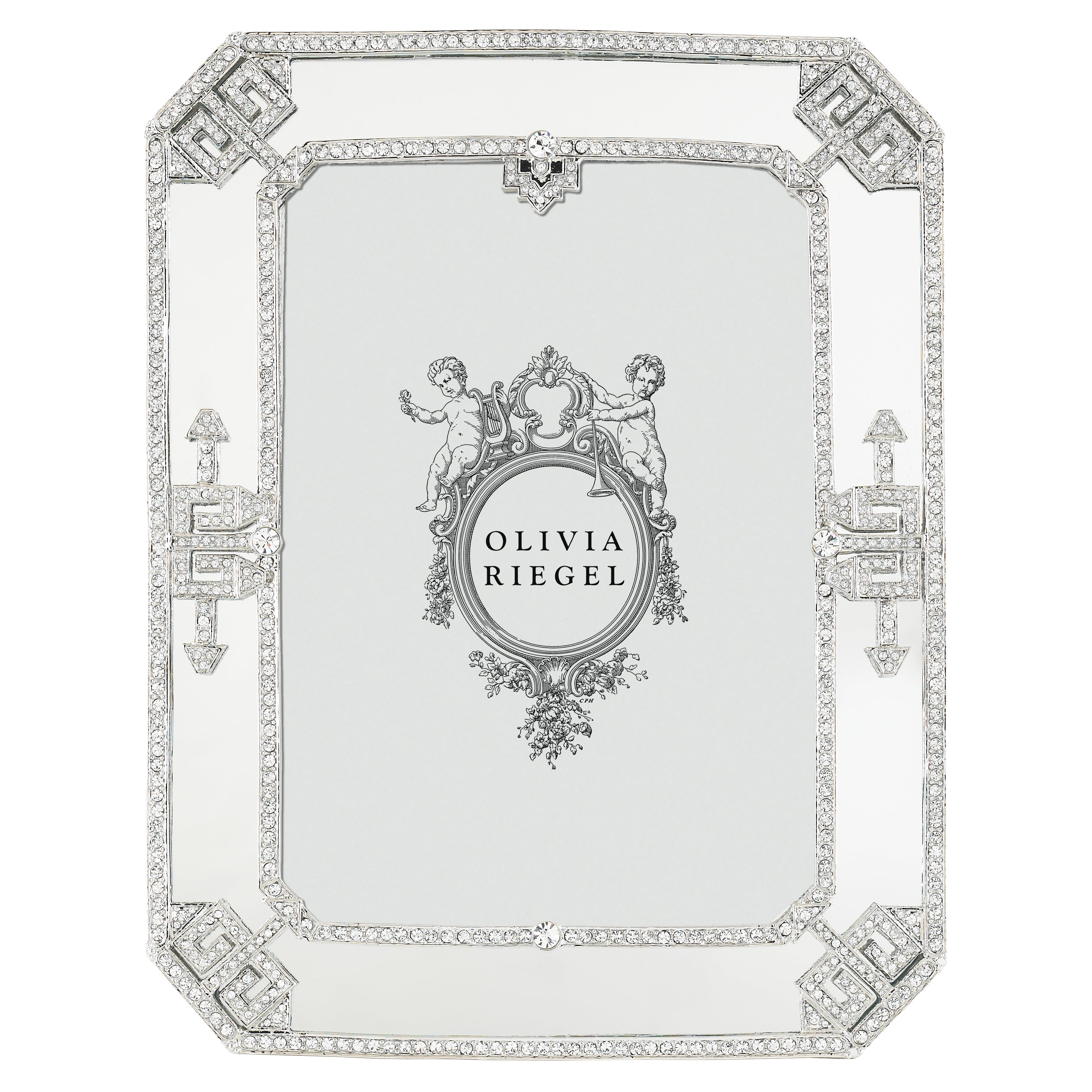 Deco styling in silver finished pewter, inlaid with mirrored glass and encrusted with clear hand-set European crystals. Elegant gray moiré silk back with easel for vertical or horizontal placement. Tarnish resistant. Signature luxury gift box included.
