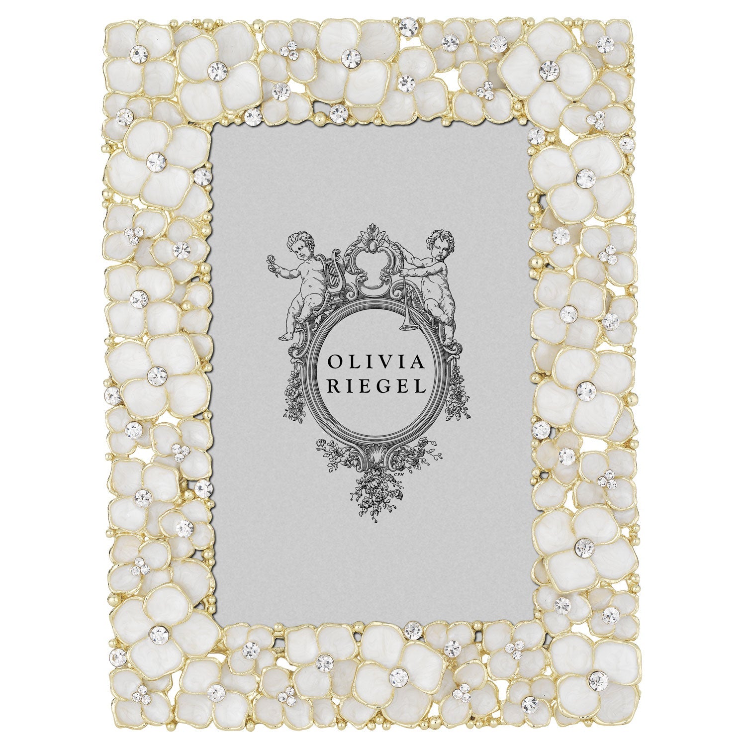 Delicate dogwood blossoms richly cast in gold finished pewter with intricate ivory hued hand-enameling and hand-set clear European crystals. Champagne hued moire silk back with easel designed for vertical or horizontal placement. Tarnish resistant. Signature luxury gift box included.