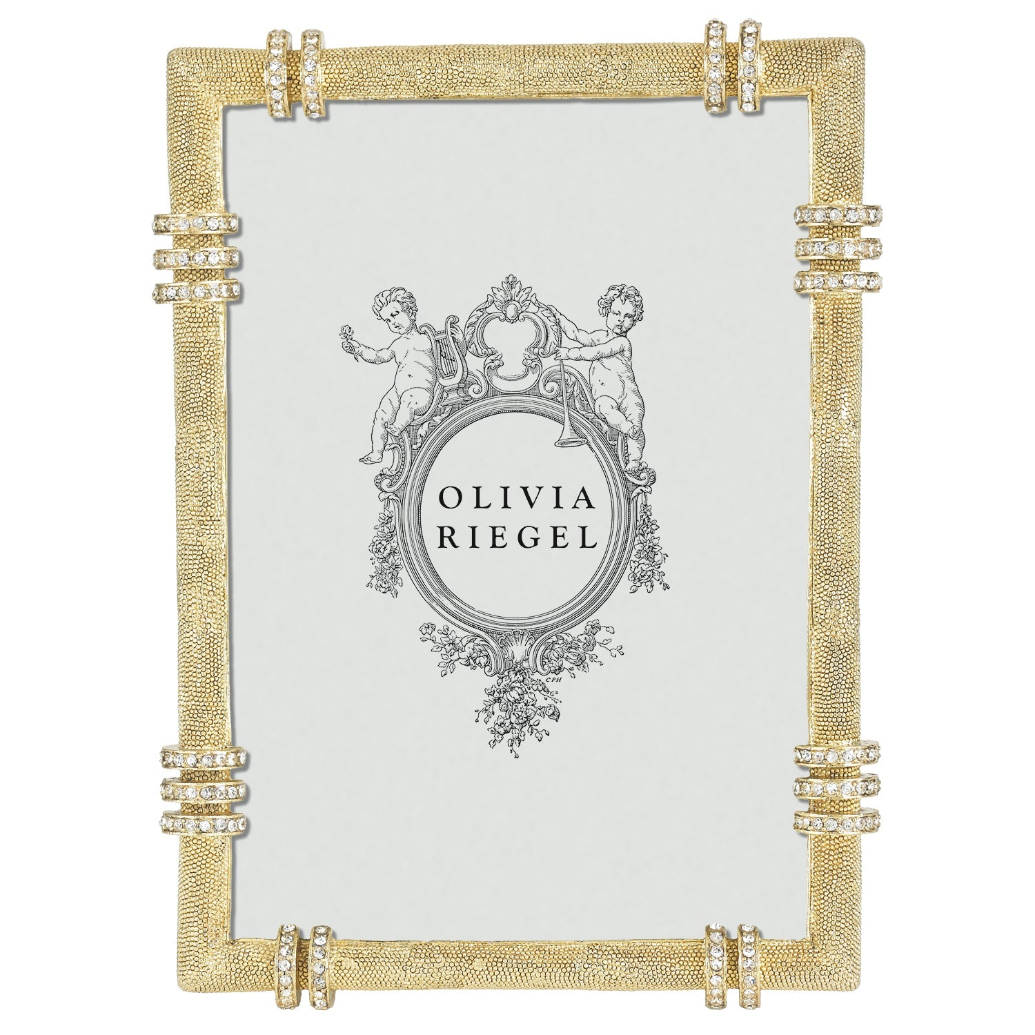 Channel-set clear European crystal banding in cast pewter with textured gold tone metal finish. Elegant moiré silk back with easel for vertical or horizontal placement. Beveled glass. Tarnish resistant. Signature luxury gift box included.
