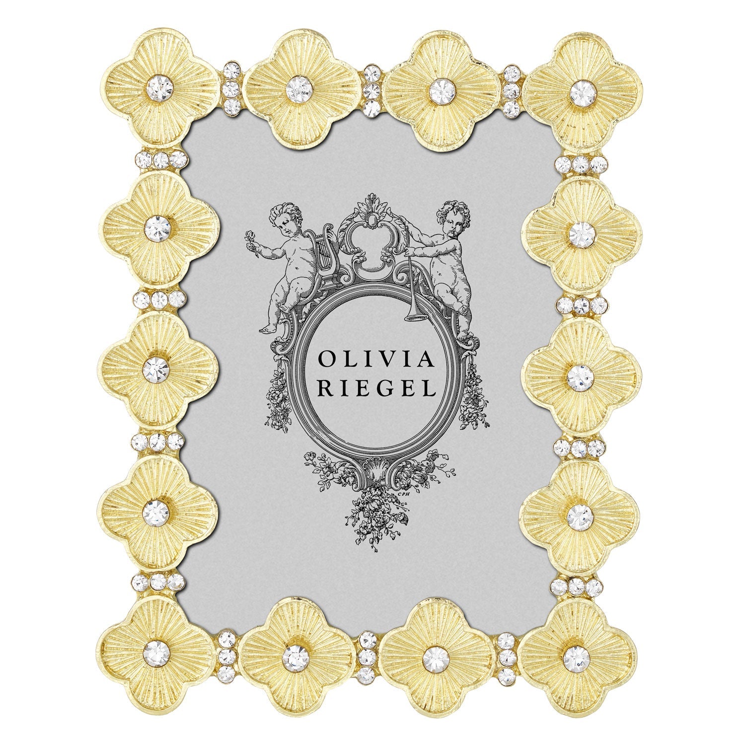 Inspired by the historic quatrefoil design—a decorative element utilized in architecture and the arts for millennia. Gold finished radial-textured pewter, adorned with hand-set clear European crystals. Elegant champagne hued moiré silk back, with easel designed for vertical or horizontal placement. Tarnish resistant. Signature luxury gift box included.