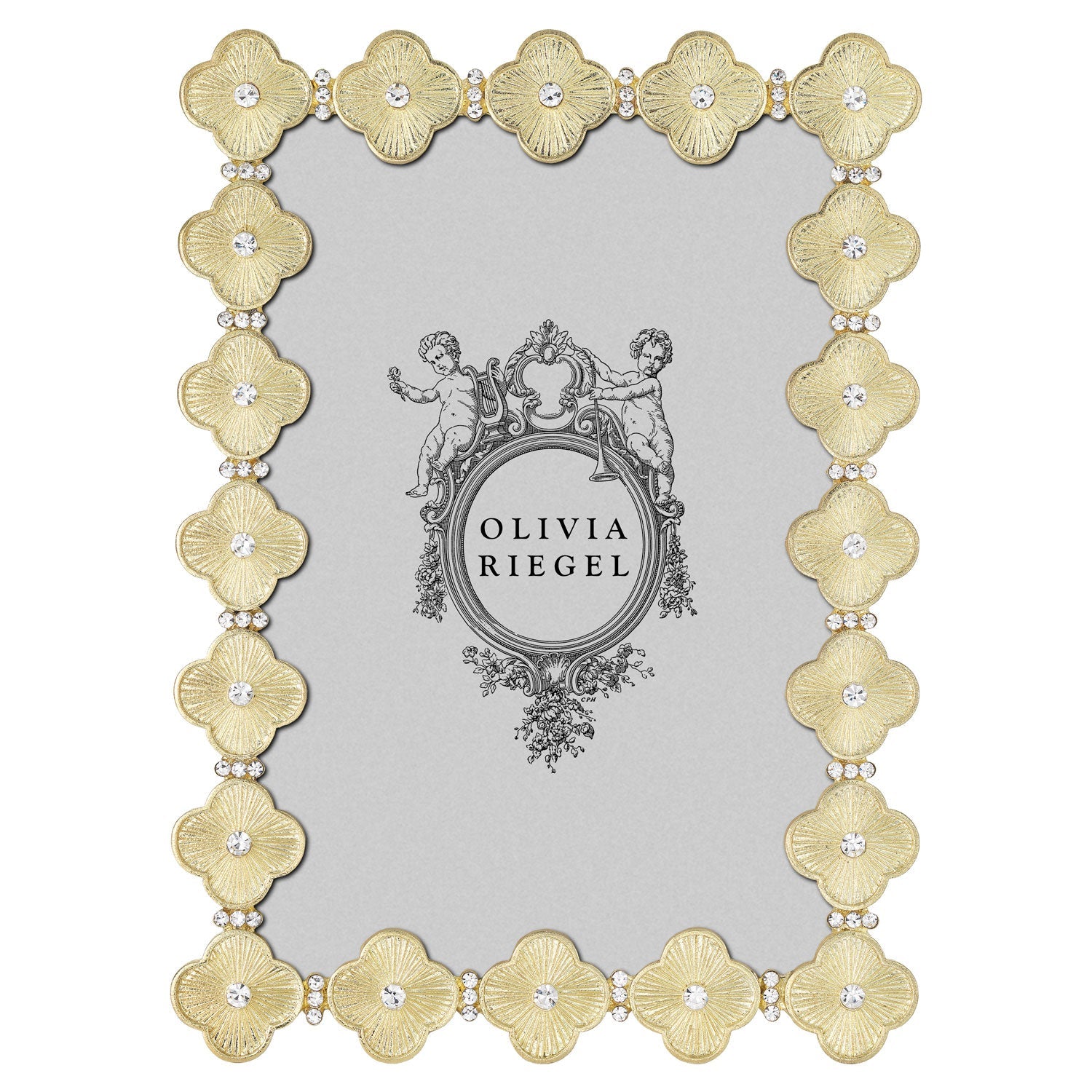 Inspired by the historic quatrefoil design—a decorative element utilized in architecture and the arts for millennia. Gold finished radial-textured pewter, adorned with hand-set clear European crystals. Elegant champagne hued moiré silk back, with easel designed for vertical or horizontal placement. Tarnish resistant. Signature luxury gift box included.