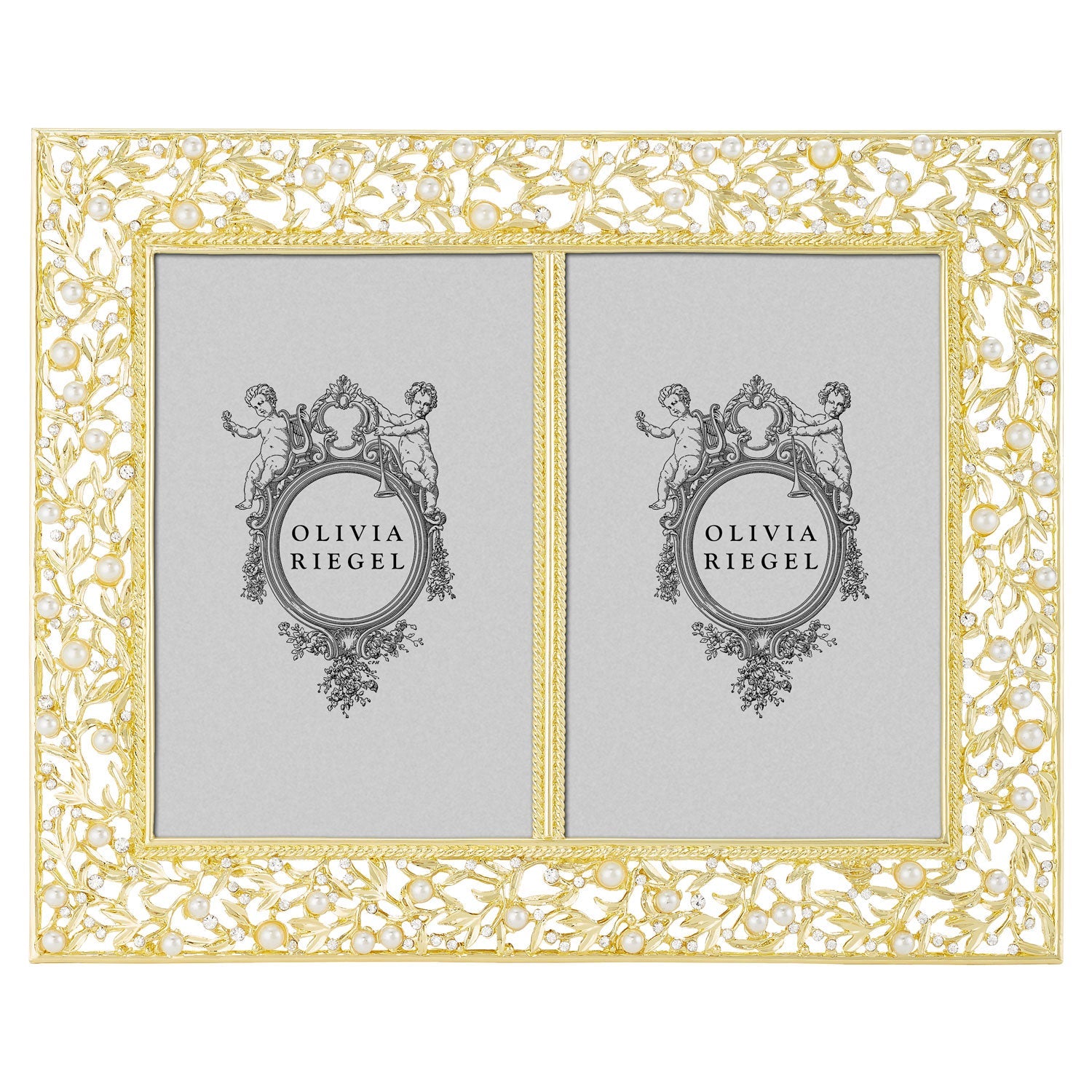 Gold finished pewter, encrusted with hand-set clear European crystals and faux pearls. Elegant champagne hued moiré silk back, with easel designed for vertical or horizontal placement. Tarnish resistant. Signature luxury gift box included.
