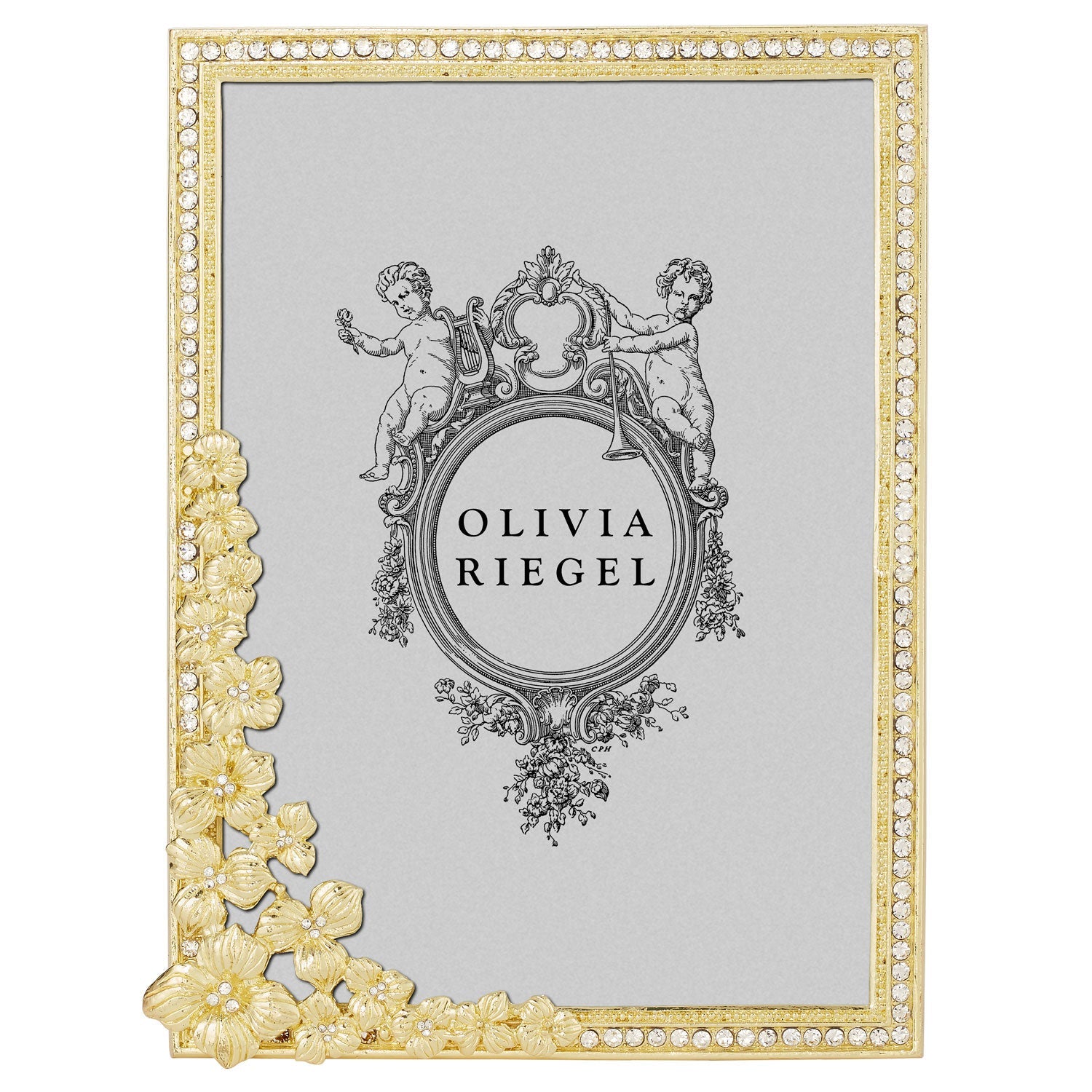 Gold finished pewter floral pattern, encrusted with hand-set clear European crystals. Elegant champagne moiré silk back, with easel designed for vertical or horizontal placement. Beveled glass. Tarnish resistant. Signature luxury gift box included.