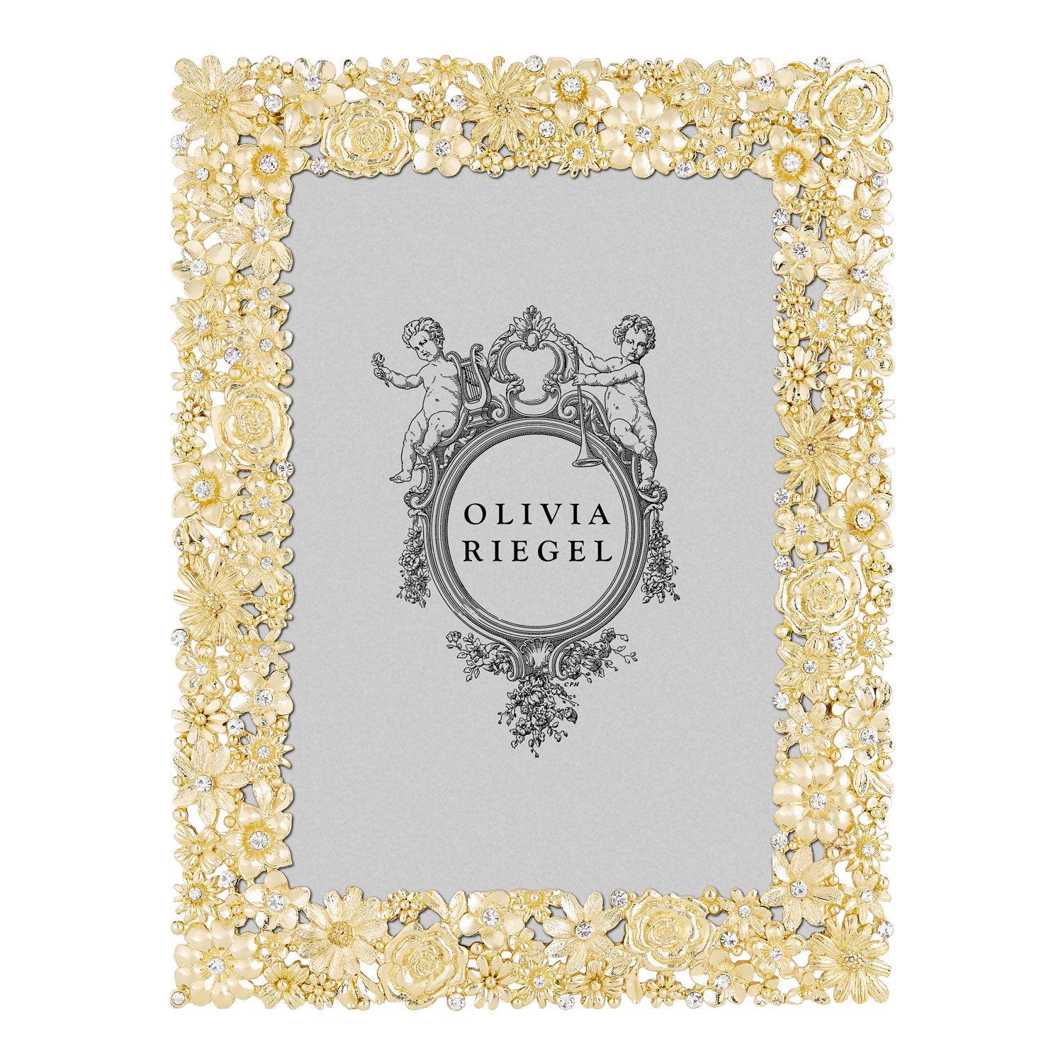Gold finished pewter garden floral pattern, adorned with hand-set clear European crystals. Elegant champagne hued moiré silk back, with easel designed for vertical or horizontal placement. Tarnish resistant. Signature luxury gift box included.
