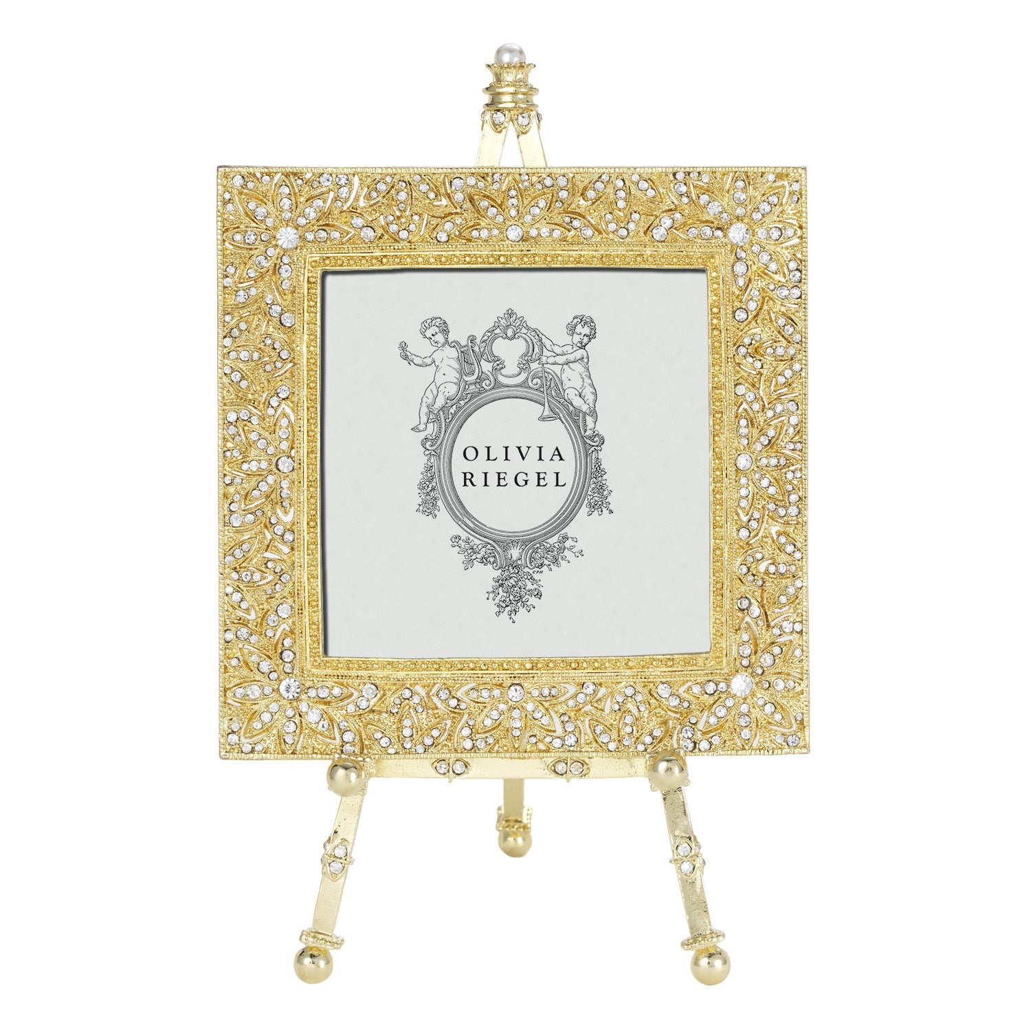 Classic estate jewelry inspired design. Gold finished pewter, encrusted with hand-set clear European crystals. Decorative easel embellished with clear European crystals and a large faux pearl. Elegant champagne hued moiré silk back. Beveled glass. Tarnish resistant. Signature luxury gift box included.