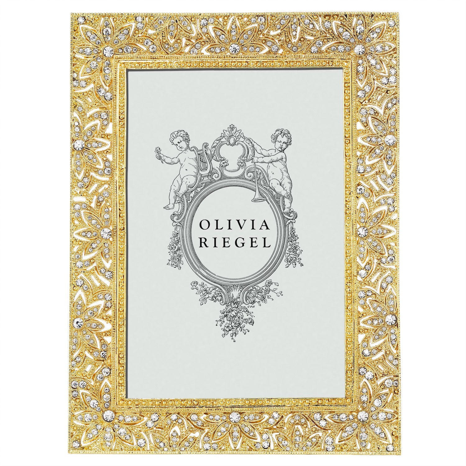 Classic estate jewelry inspired design. Gold finished pewter, encrusted with hand-set clear European crystals. Elegant champagne hued moiré silk back with easel designed for vertical or horizontal placement. Beveled glass. Tarnish resistant. Signature luxury gift box included.
