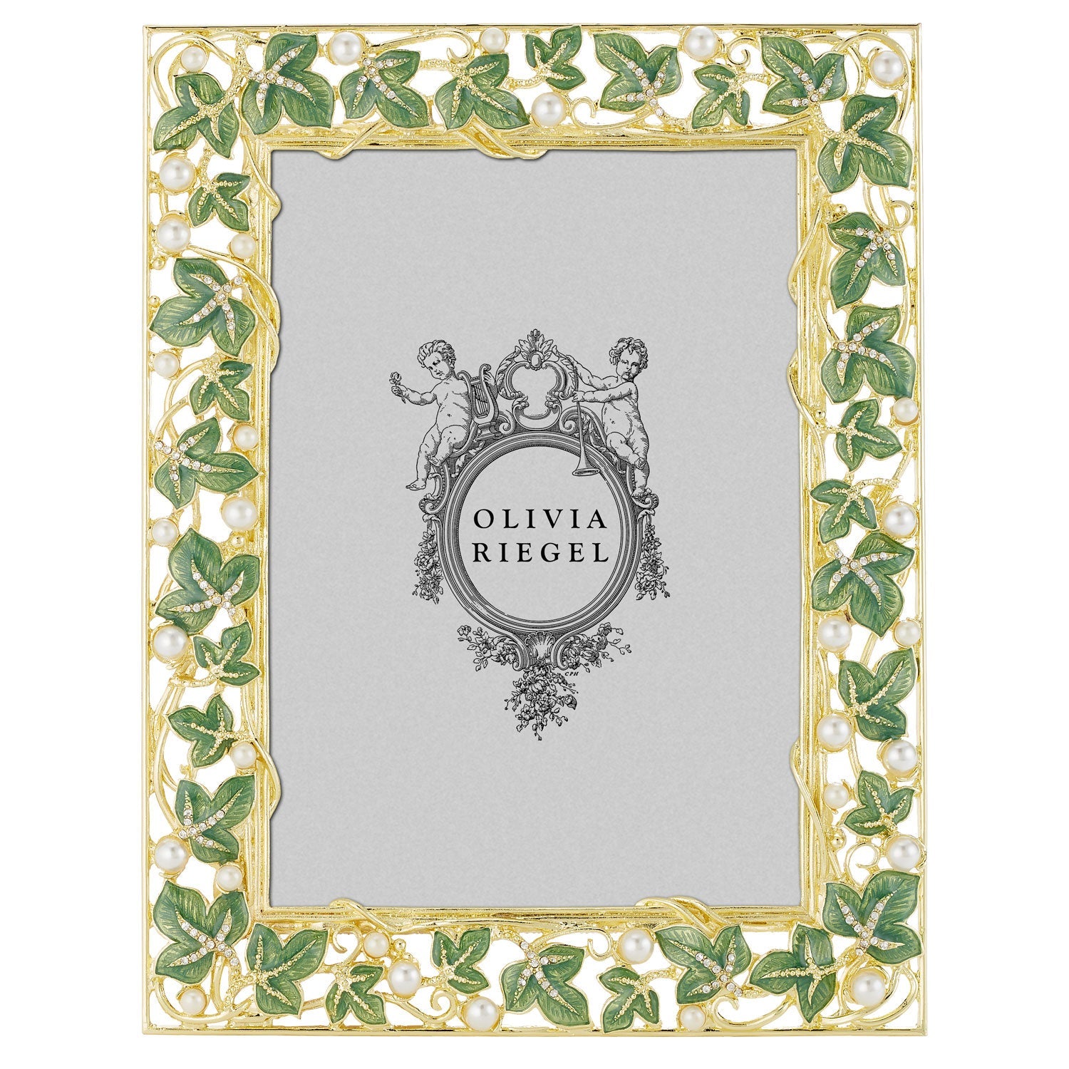 Gold finished pewter ivy vine pattern, encrusted with hand-set clear European crystals and faux pearls. Celadon green toned guilloché style hand-enameling. Elegant champagne hued moiré silk back, with easel for vertical or horizontal placement. Tarnish resistant. Signature luxury gift box included.