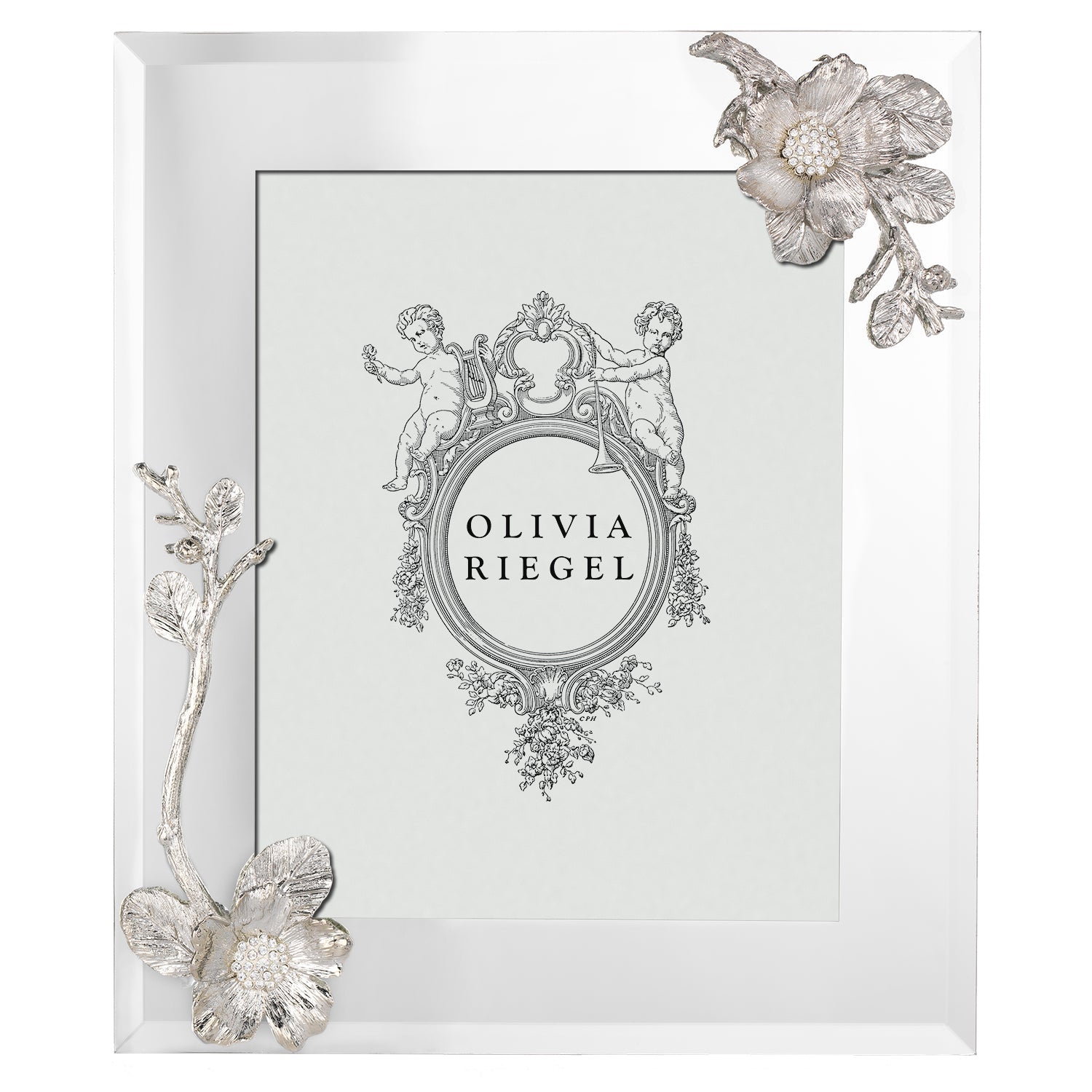 Beveled mirrored glass with silver finished pewter blossom, inspired by the beautiful Rugosa Rose. Hand-set clear European crystals. Elegant gray moiré silk back, with easel designed for vertical or horizontal placement. Tarnish resistant. Signature luxury gift box included.
