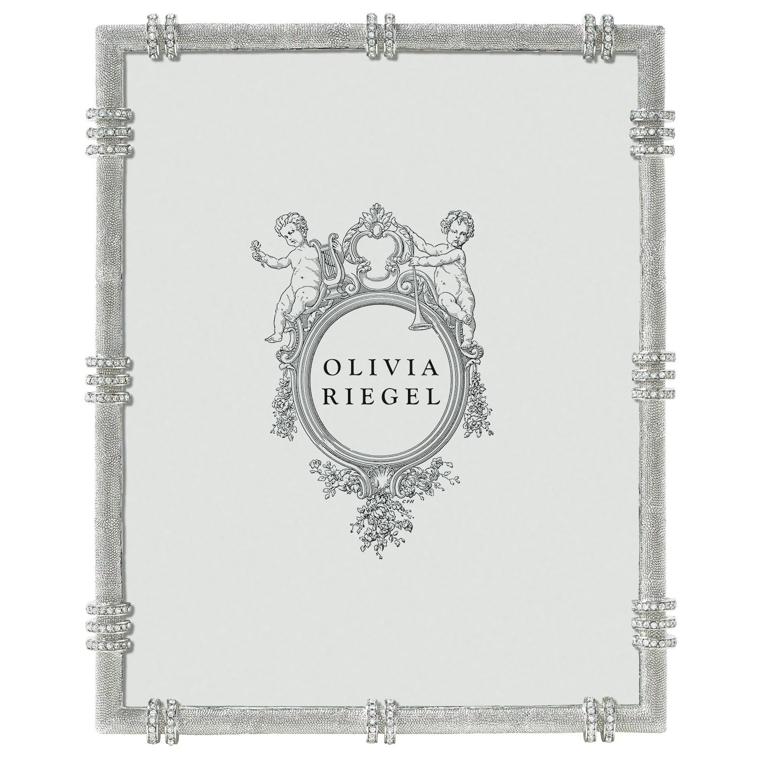 Channel-set clear European crystal banding with textured cast pewter silver tone metal finish and elegant moiré silk back with easel for vertical or horizontal placement. Beveled glass. Tarnish resistant. Signature luxury gift box included.