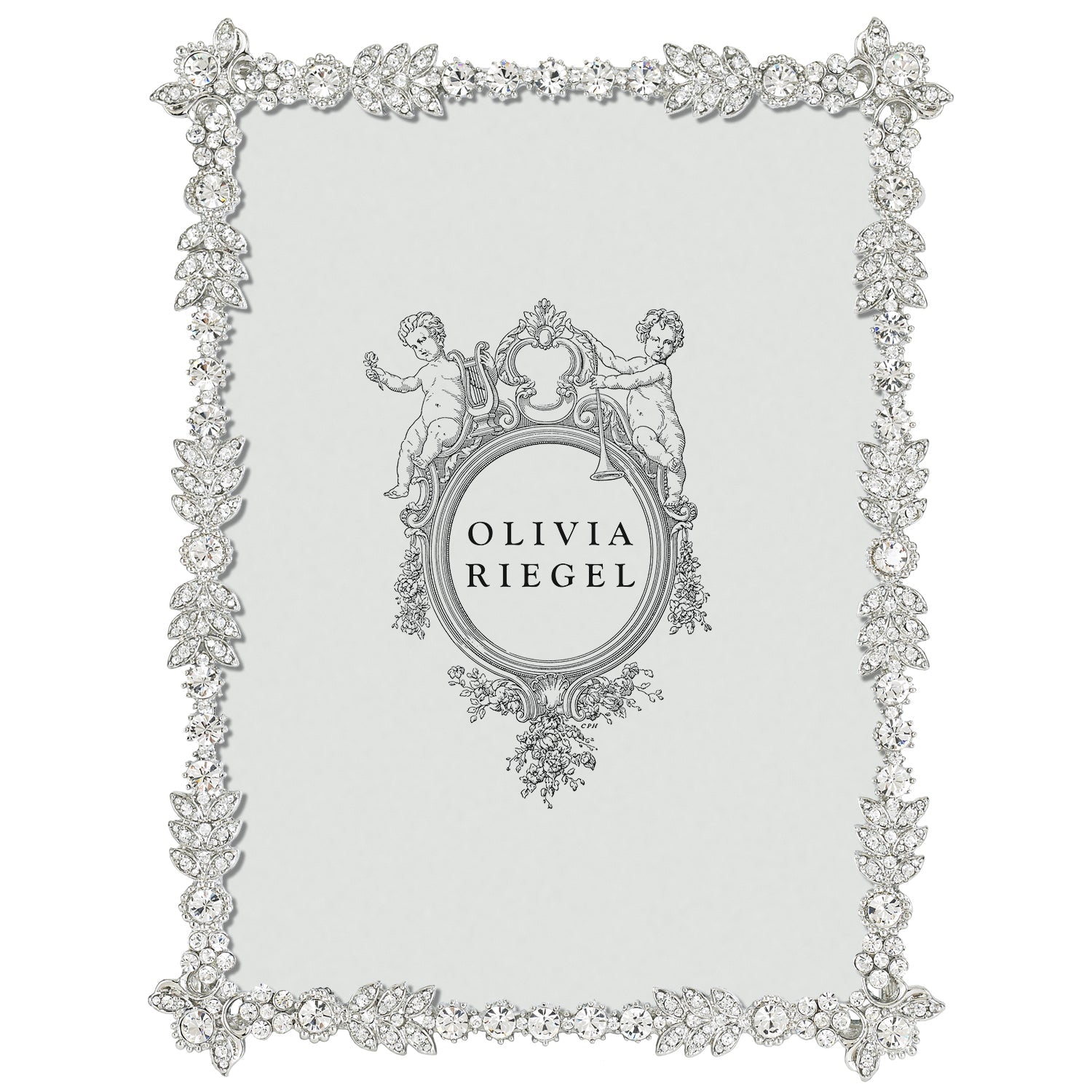 Royal vintage appeal with hundreds of hand-set clear European crystals in silver finished cast pewter. Elegant gray hued moiré silk easel back designed for vertical or horizontal placement. Tarnish resistant. Signature luxury gift box included.