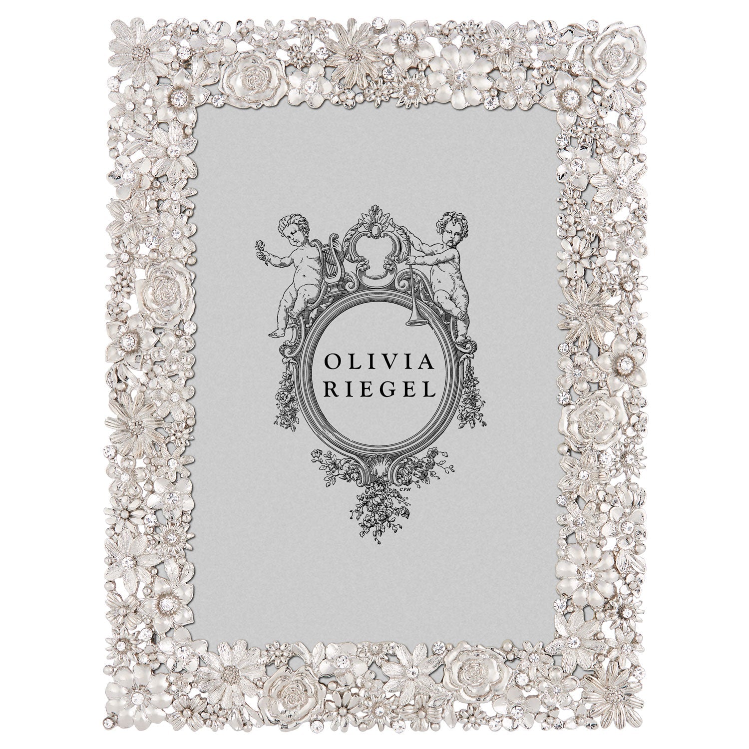 Silver finished pewter garden floral pattern, adorned with hand-set clear European crystals. Elegant gray hued moiré silk back, with easel designed for vertical or horizontal placement. Tarnish resistant. Signature luxury gift box included.