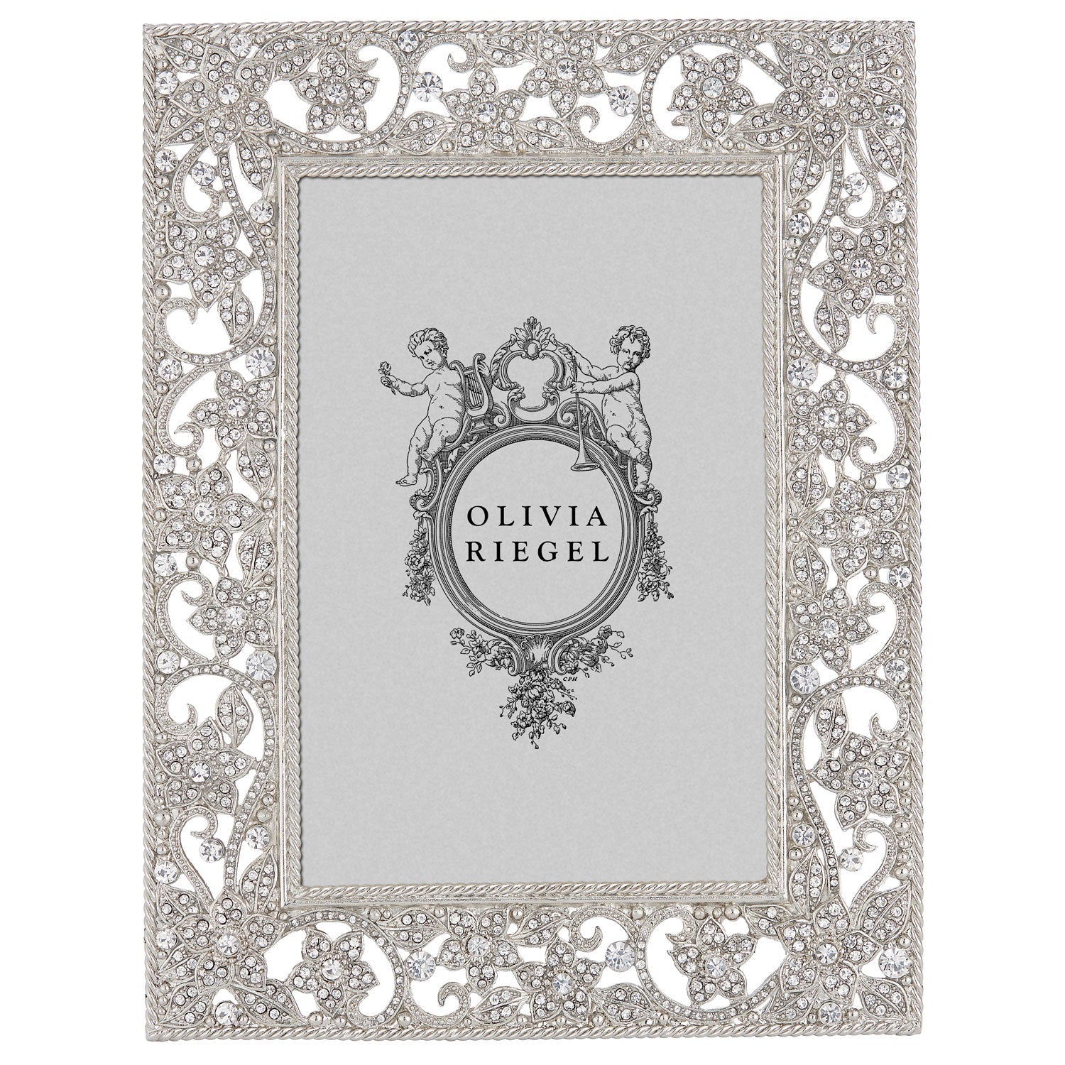 Silver finished pewter floral pattern, richly encrusted with hand-set clear European crystals. Elegant gray hued moiré silk back, with easel designed for vertical or horizontal placement. Beveled glass. Tarnish resistant. Signature luxury gift box included.