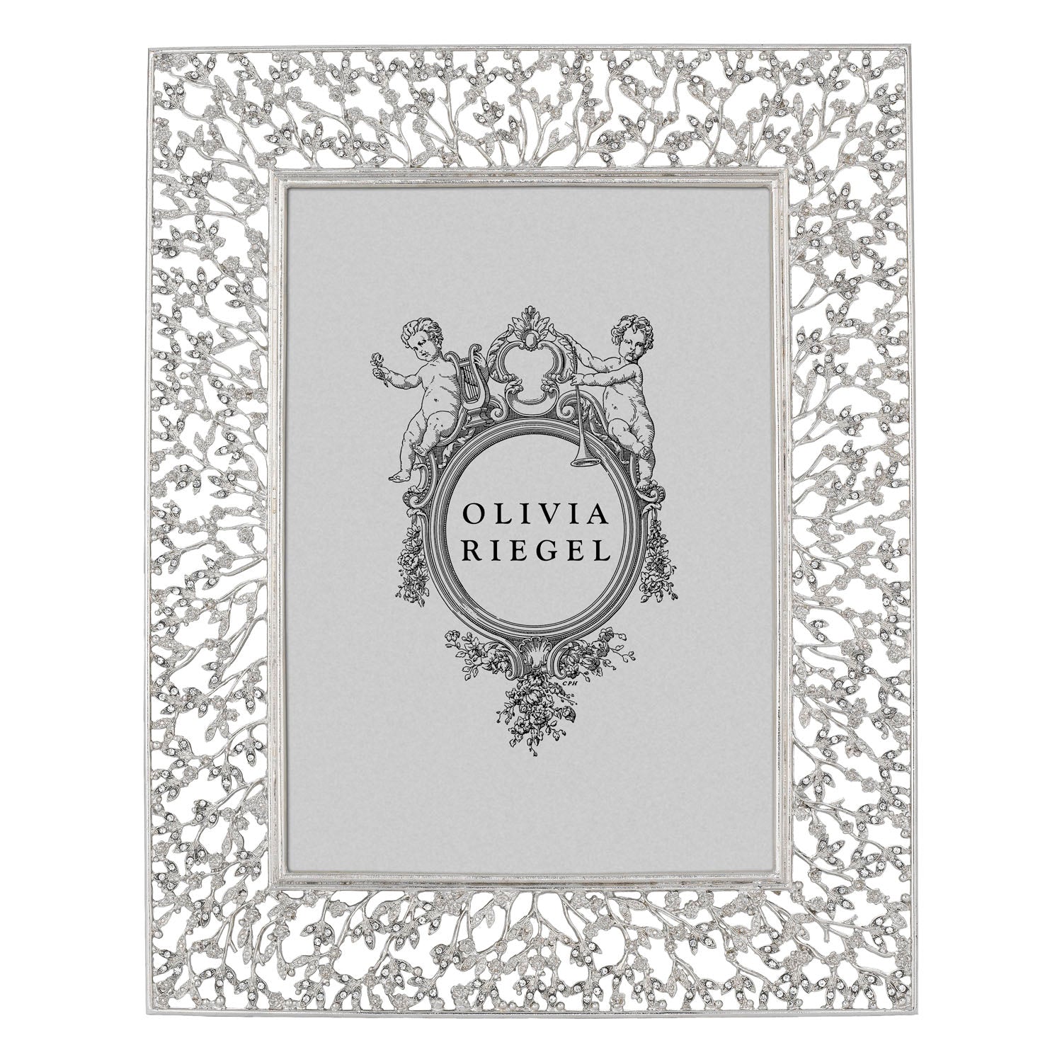 Contemporary intricate silver finished pewter branch pattern, adorned with hand-set clear European crystals. Elegant gray moiré silk back, with easel designed for vertical or horizontal placement. Beveled glass. Tarnish resistant. Signature luxury gift box included.