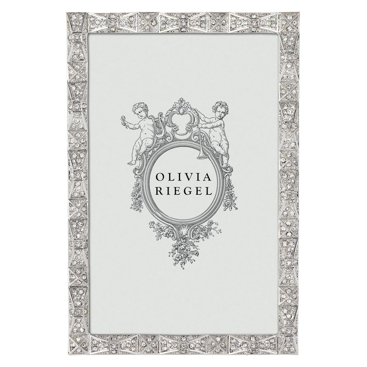 Vintage inspired silver finished cast pewter pattern with hand-set clear pavé European crystals. Elegant gray moiré silk back with easel designed for vertical or horizontal placement. Tarnish resistant. Signature luxury gift box included.