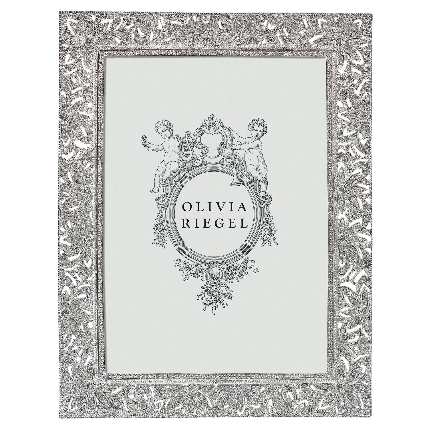Classic estate jewelry inspired design. Silver finished pewter, encrusted with hand-set clear European crystals. Elegant gray moiré silk back with easel designed for vertical or horizontal placement. Beveled glass. Tarnish resistant. Signature luxury gift box included.