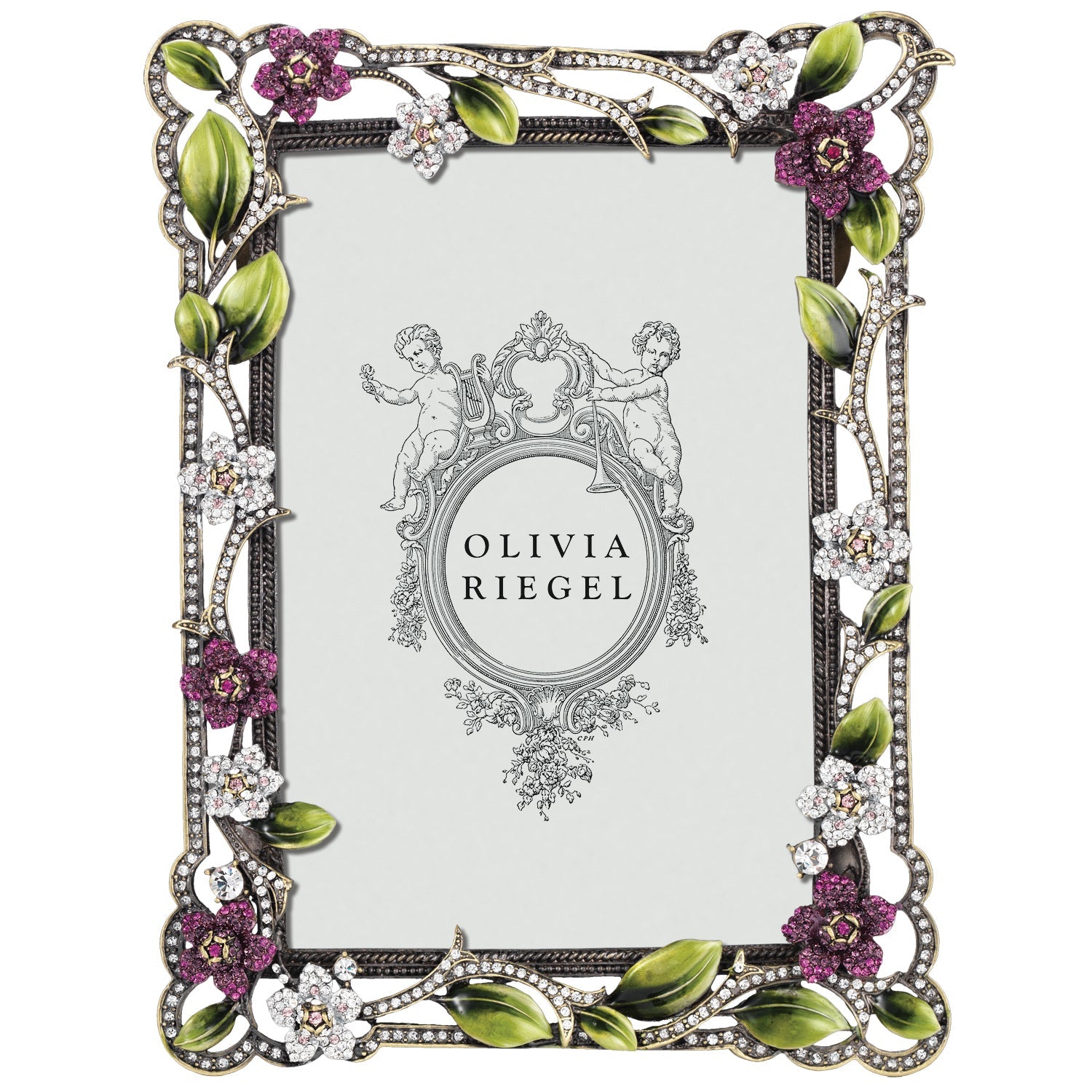 Bronze finished floral pattern, encrusted with hand-set clear and pink pavé European crystals. Green toned hand-enameling. Elegant champagne hued moiré silk back with easel for vertical or horizontal placement. Beveled glass. Tarnish resistant. Signature luxury gift box included.