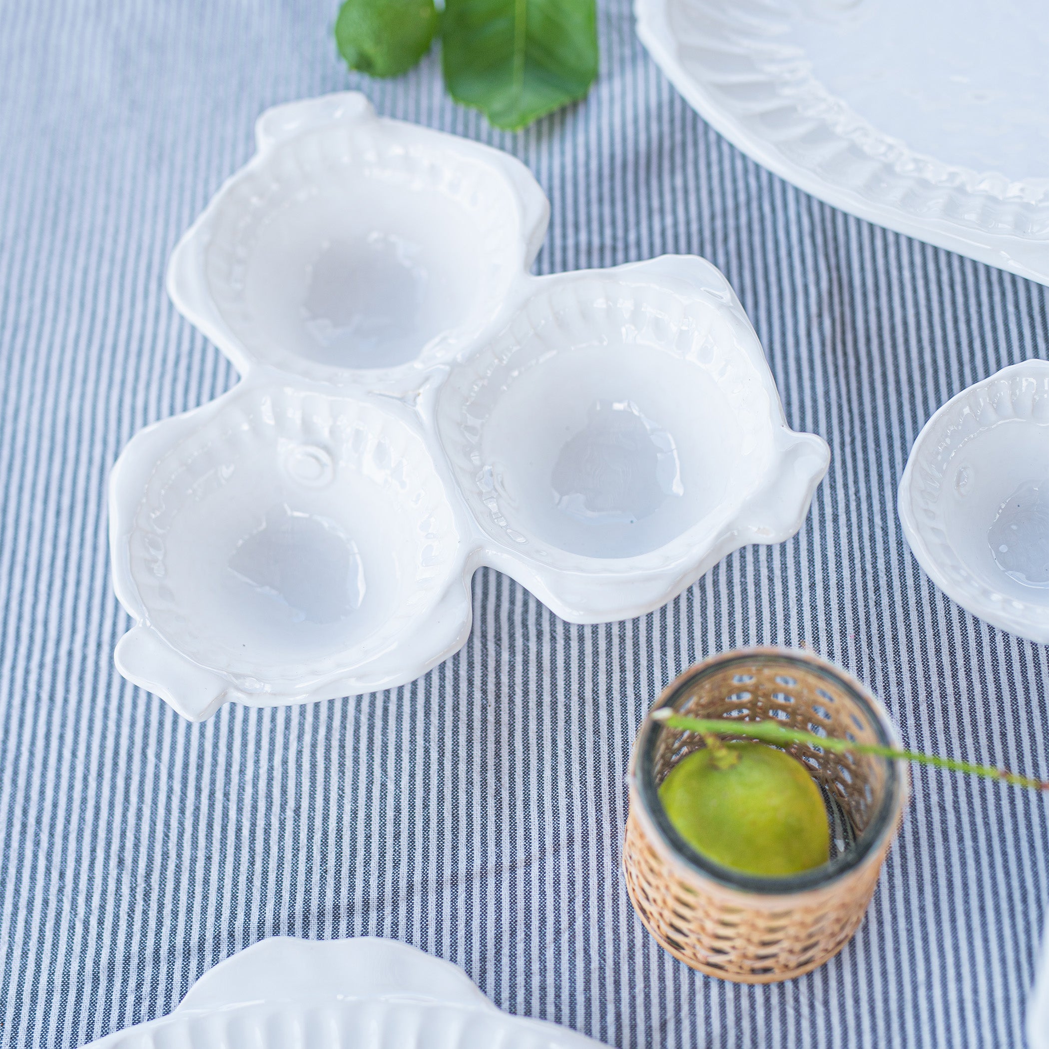 Playing off the handpressed edges of Pietra Serena, the Pesca Serena Three-Part Server has charming fish details to create a playful yet sophisticated coastal table.