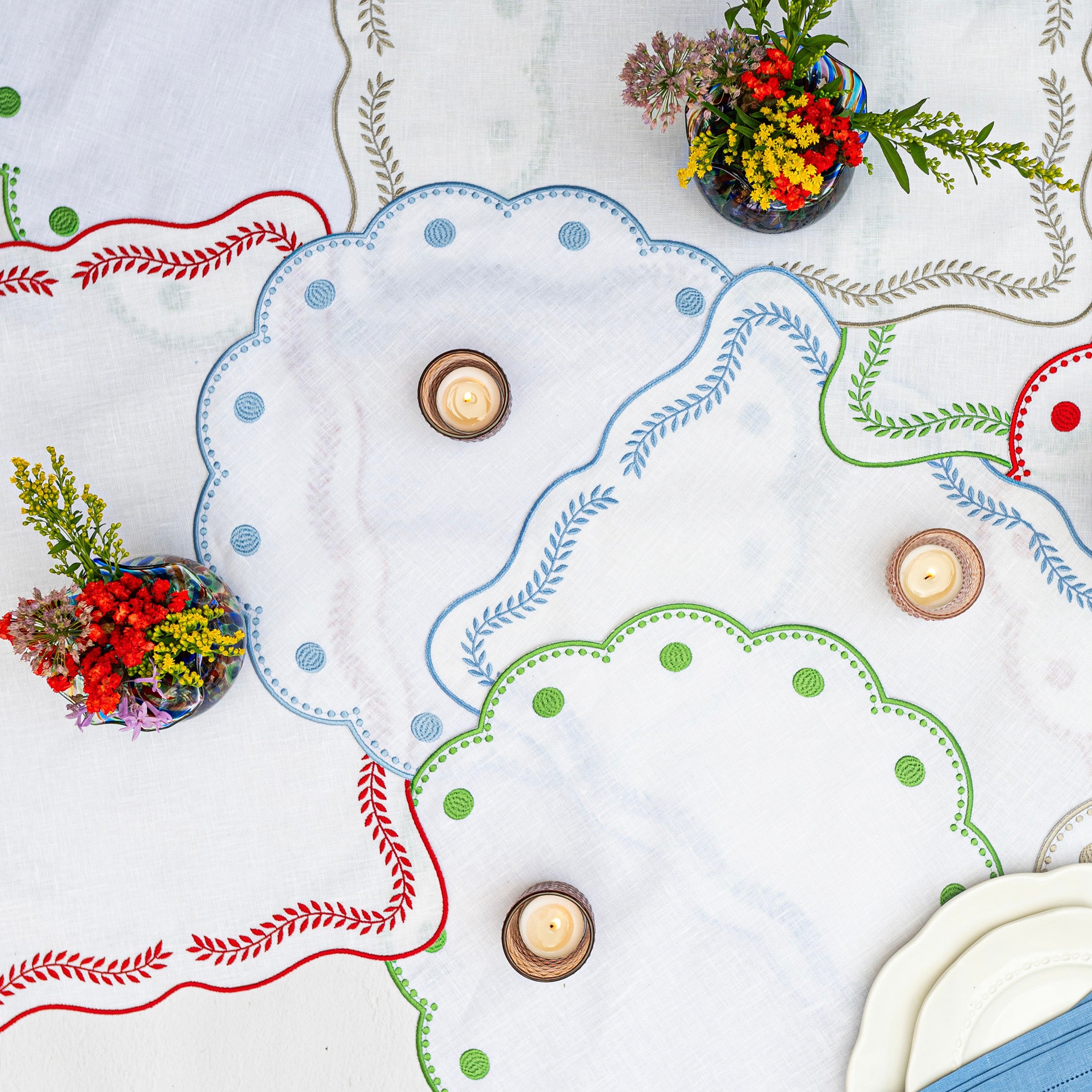 Tessuti Linens are the epitome of easygoing elegance. The Tessuti White Placemats with Cornflower Blue Dots are made of 100% linen with a light acrylic coating, assuring they remain stain resistant and a breeze to wipe clean.