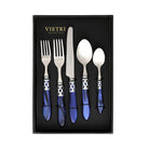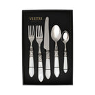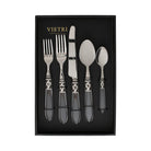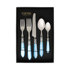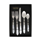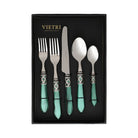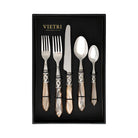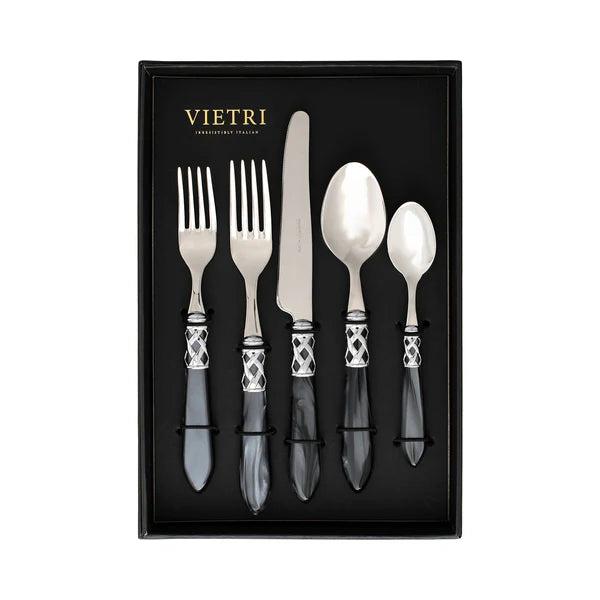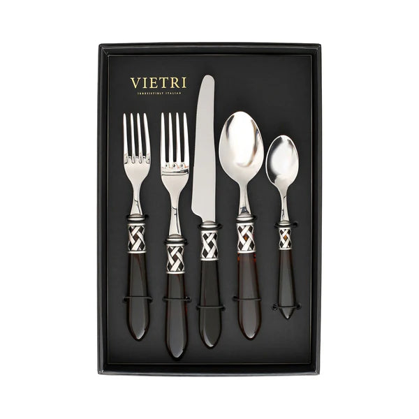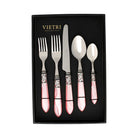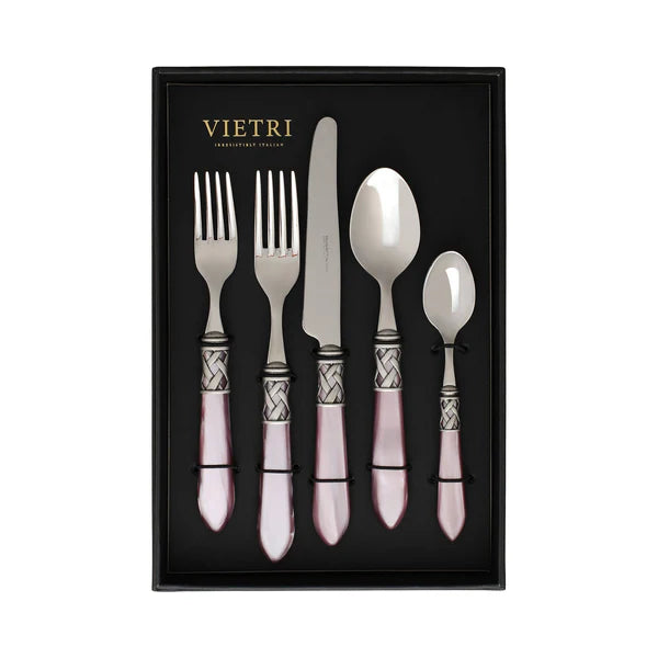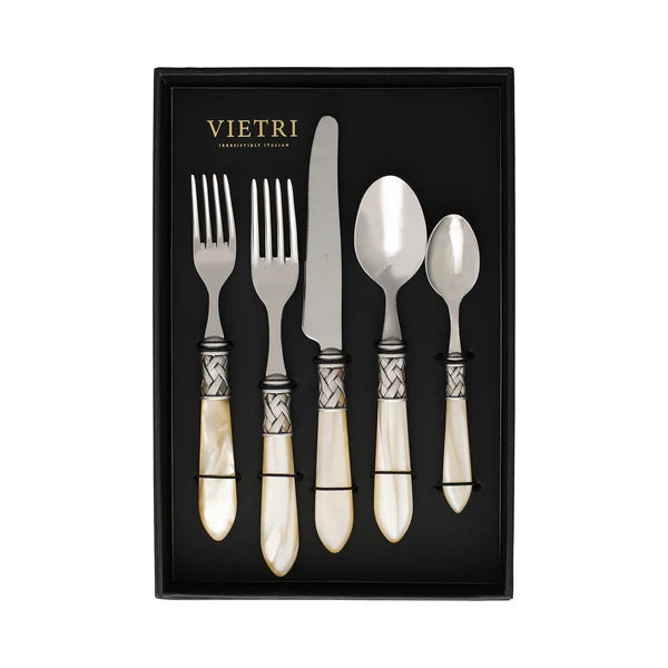 The Aladdin Antique Five-Piece Place Setting - Set of 4 features elegant pearlized handles with the strength of high-grade acrylic and 18/10 stainless steel. The handles are wrapped with intricate lattice metalwork.