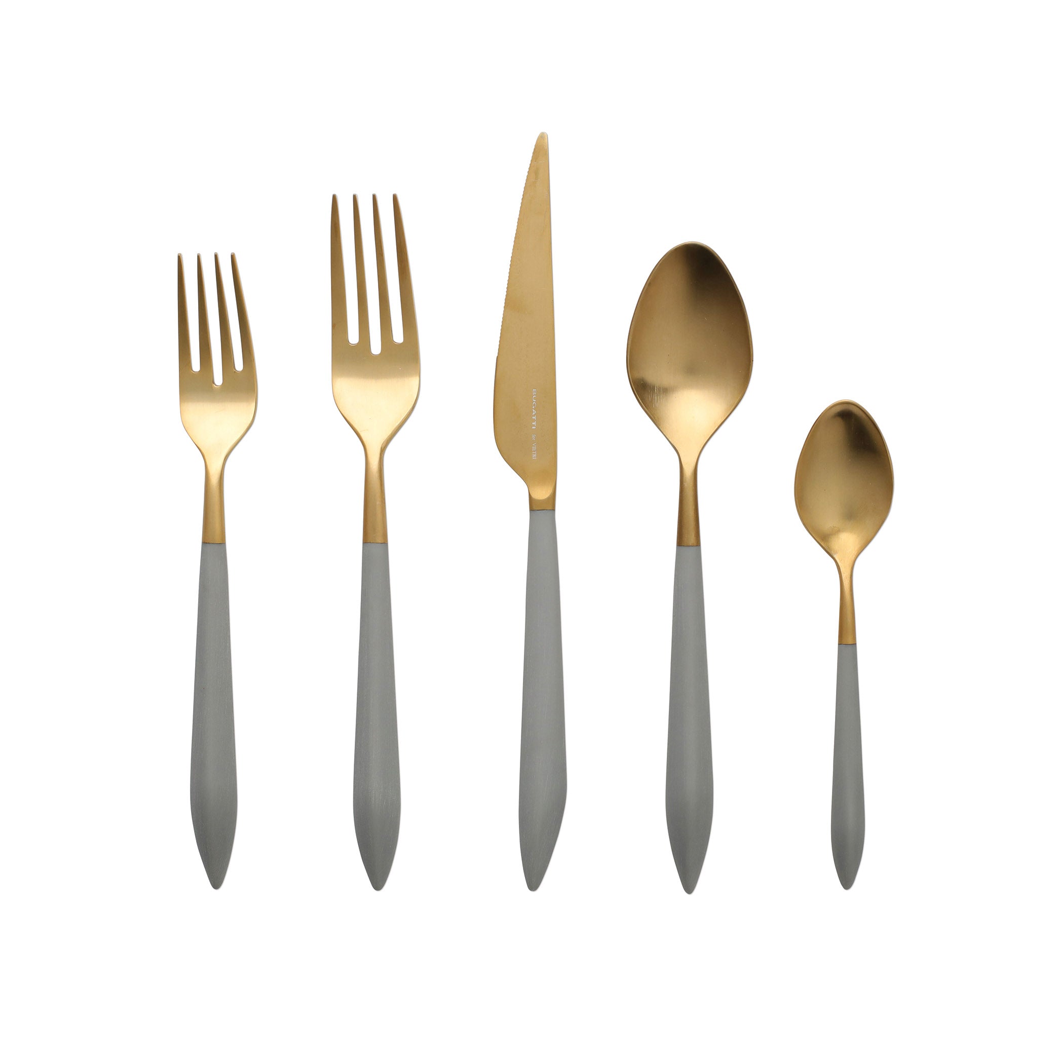 The contemporary matte handle found on the Ares Oro Five-Piece Place Setting provides perfect balance and weight for a luxury flatware experience. Oro, the brushed gold, finishes off the utensil in 18/10 stainless steel and resin.