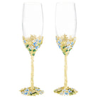 Celebrate garden enchantment with these bee and floral patterned stems. Gold finished pewter with intricate blue and green hued hand-enameling and hand-set clear European crystals. Tarnish resistant. Glass can be acid etched. Hand wash. Signature luxury gift box included.