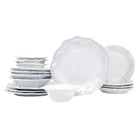 Italian for enchantment, Incanto is inspired by Italy's art, landscape, and Venetian history. The soft ripples of the Adriatic Sea, the columns of the Palladian villas along the Brenta River, the beautiful lace of Venice’s Burano Island, and 17th century baroque architecture are reimagined in the dinnerware’s design, and the result is a captivating collection made to be mixed and matched. The Incanto Assorted Sixteen-Piece Place Setting includes 4 Lace European dinner plates, 4 Stripe salad plates, 4 Ruffle pasta bowls, and 4 Baroque cereal bowls.