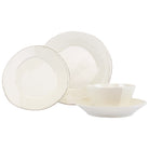 Beloved for its sophisticated simplicity, versatility, and durability, Lastra is our bestselling collection. The Lastra Four-Piece Place Setting is wonderful starter kit with 1 European dinner plate, 1 salad plate, 1 pasta bowl, and 1 cereal bowl. Lastra’s design was inspired by the circular wooden slabs used for centuries to create the outer mold in cheesemaking throughout Italy. When fashioned together with twine, the hoop was left with a slight overlap to help maintain the shape of the cheese mold. Maestro molder Stefano Roselli incorporates the overlapping detail into the entire design, from its foot to its rim. A dark dusting on the edges of each piece suggests the ash that was used to preserve these cheeses and highlights each unique silhouette.