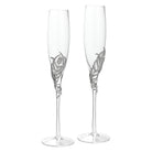 Glass stems, embellished with flowing silver finished pewter peacock feathers, encrusted with hand-set clear European crystals. Glass can be acid etched. Tarnish resistant. Hand-wash. Signature luxury gift box included.