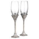 Classic estate jewelry inspired design. Silver finished pewter stems, encrusted with hand-set clear European crystals. Glass can be acid etched. Tarnish resistant. Hand wash. Signature luxury gift box included.