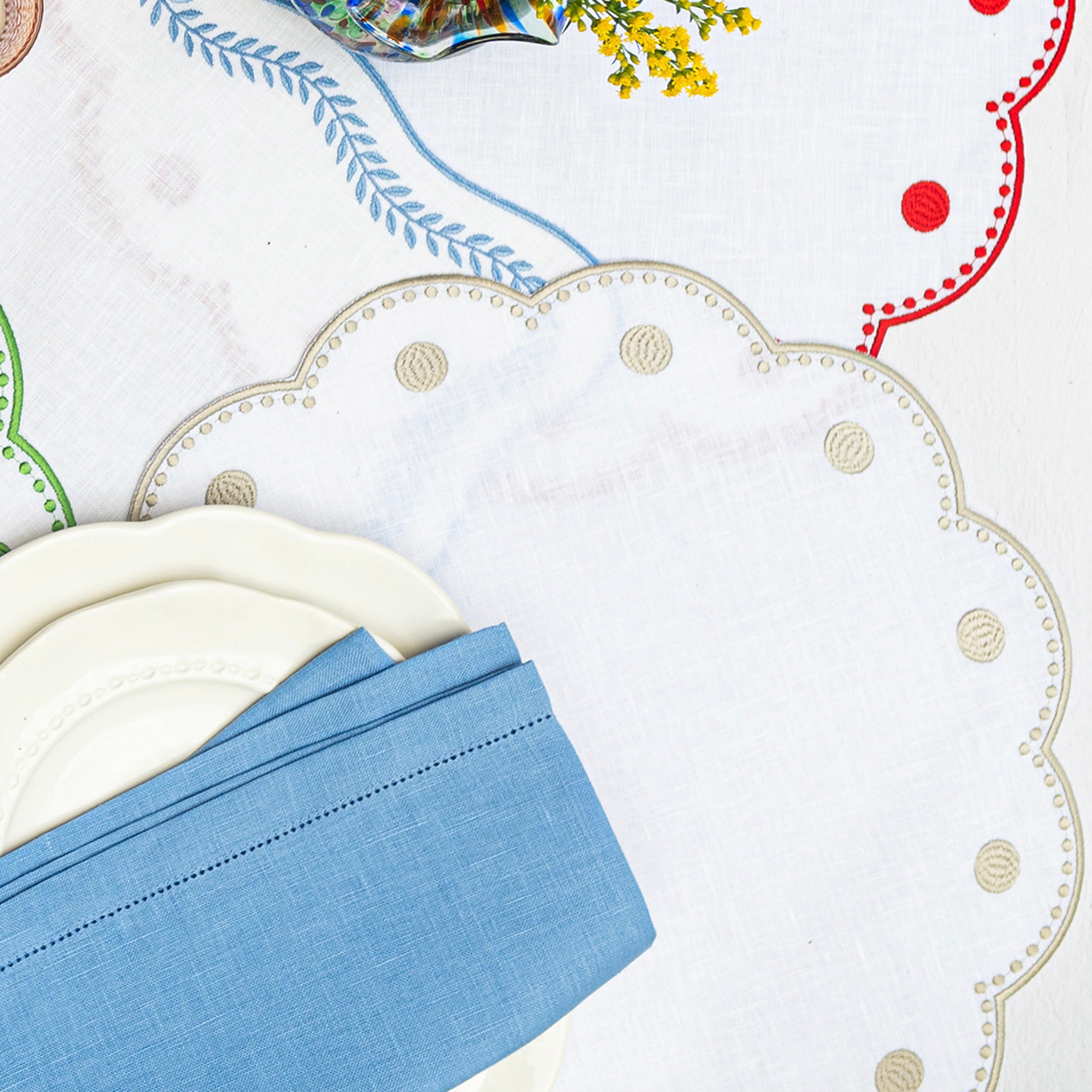 Tessuti Linens are the epitome of easygoing elegance. The Tessuti White Placemats with Natural Dots are made of 100% linen with a light acrylic coating, assuring they remain stain resistant and a breeze to wipe clean.