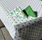 This round 70" tablecloth features a classic Fleur de Lys pattern in fresh green and white colors. Made from Enduit coated cotton, it is easy to wipe clean, making it perfect for everyday meals or casual entertaining. Its elegant design adds a touch of timeless charm to any table setting.