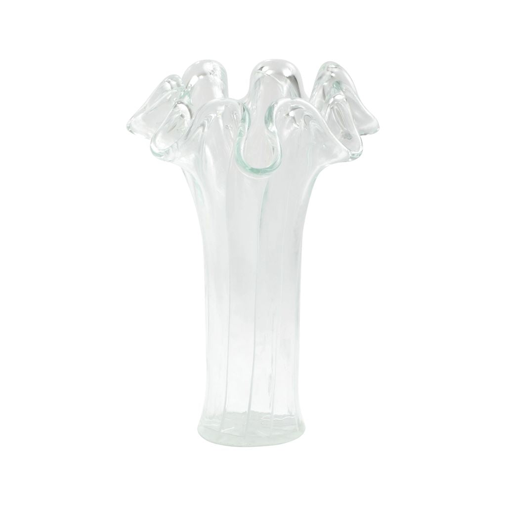 Mouthblown in Italy, the Onda Glass Clear with White Lines Short Vase makes a sophisticated centerpiece on its own or filled with flowers freshly picked from your garden, or given by someone special.
