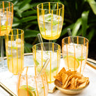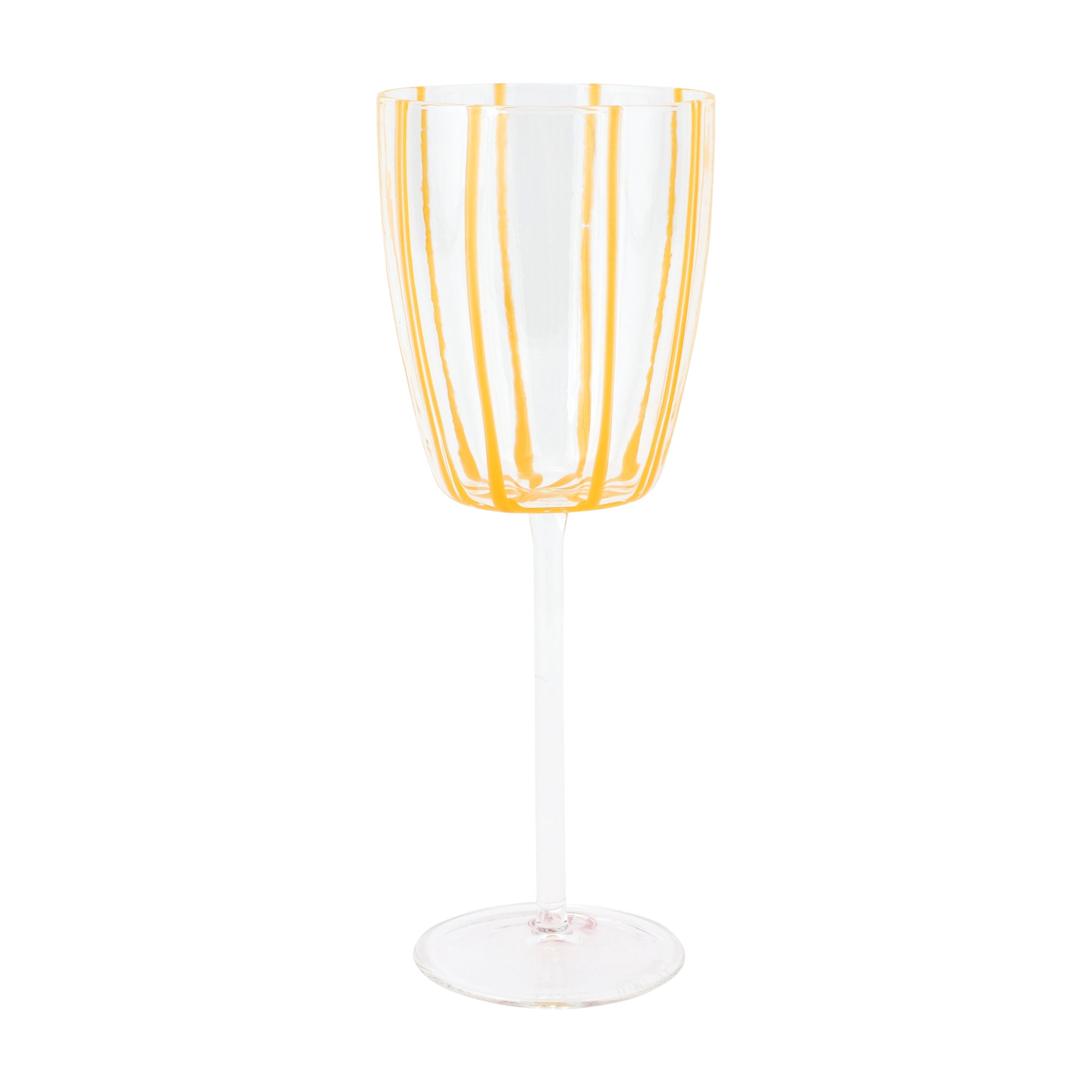 Mouthblown by skilled artisans, the Nuovo Stripe Orange Wine Glass features painterly stripes gliding down each glass, and the result is a fresh and fun addition to your table.