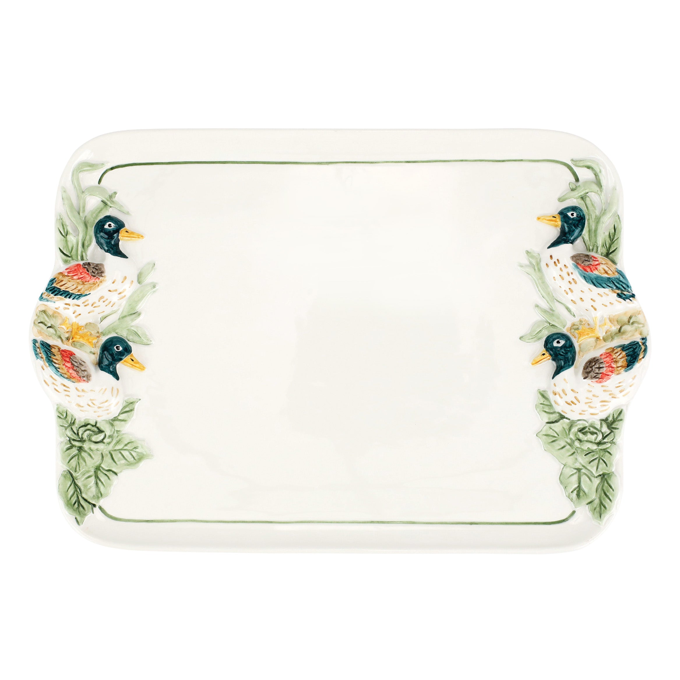 Handpainted in Tuscany, the Wildlife Mallard Rectangular Platter brings the thrill of the hunt to your table. This whimsical collection combines a series of animals all representative of the grandeur of wildlife.